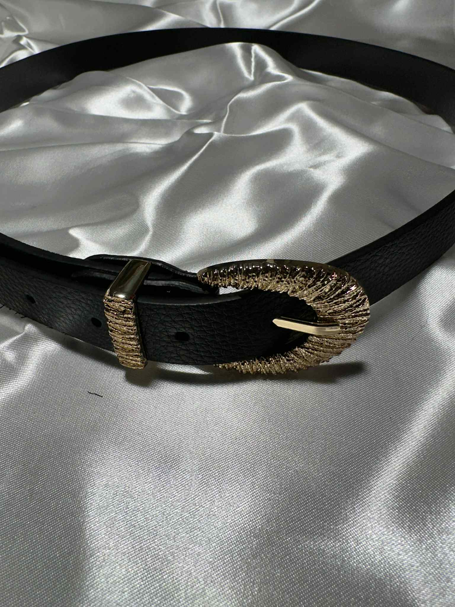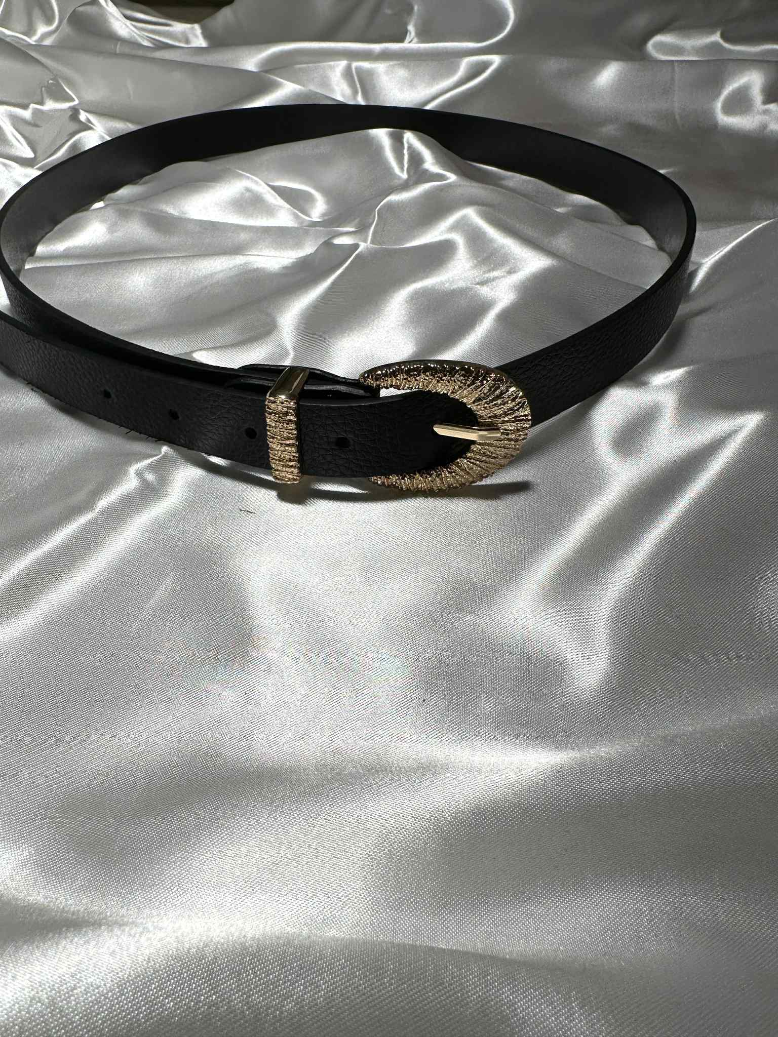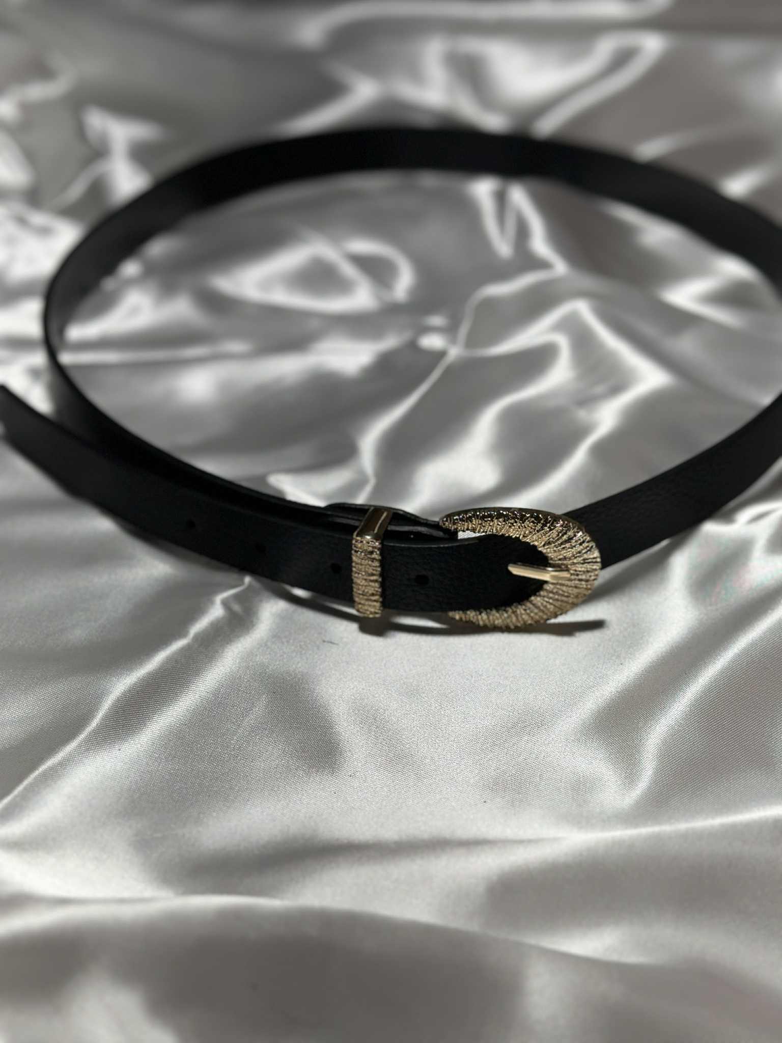Αυτή η ζώνη κατασκευασμένη από συνθετικό μαύρο δέρμα και διαθέτει την χαρακτηριστική χρυσή ανάγλυφη πόρπη. Αντιπροσωπεύοντας την εκλεπτυσμένη ταυτότητα,προσθέτει μια πινελιά αποκλειστικότητας και κομψότητας σε αυτό το εκλεπτυσμένο αξεσουάρ. Ιδανική τόσο για casual όσο και για επίσημες εμφανίσεις, αυτή η ζώνη συνδυάζει διαχρονικό σχεδιασμό, εξαιρετική δεξιοτεχνία και μοντέρνο στιλ.