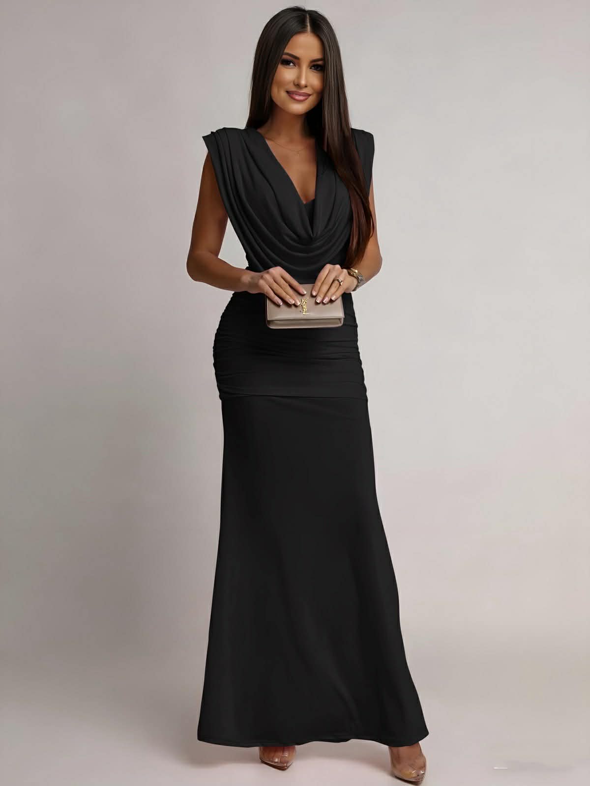 Εντυπωσιακό maxi φόρεμα που αποπνέει κομψότητα και θηλυκότητα σε κάθε του λεπτομέρεια. Το επάνω μέρος διαθέτει ντραπέ λαιμόκοψη που αγκαλιάζει όμορφα το μπούστο, δημιουργώντας ένα sophisticated και διαχρονικό αποτέλεσμα. Η εφαρμοστή γραμμή στη μέση και στους γοφούς αναδεικνύει τη σιλουέτα, ενώ το κάτω μέρος ανοίγει απαλά σε γραμμή που προσφέρει κίνηση και χάρη σε κάθε βήμα. Ιδανικό για ιδιαίτερες περιστάσεις, βραδινές εξόδους ή events που απαιτούν κομψή εμφάνιση.