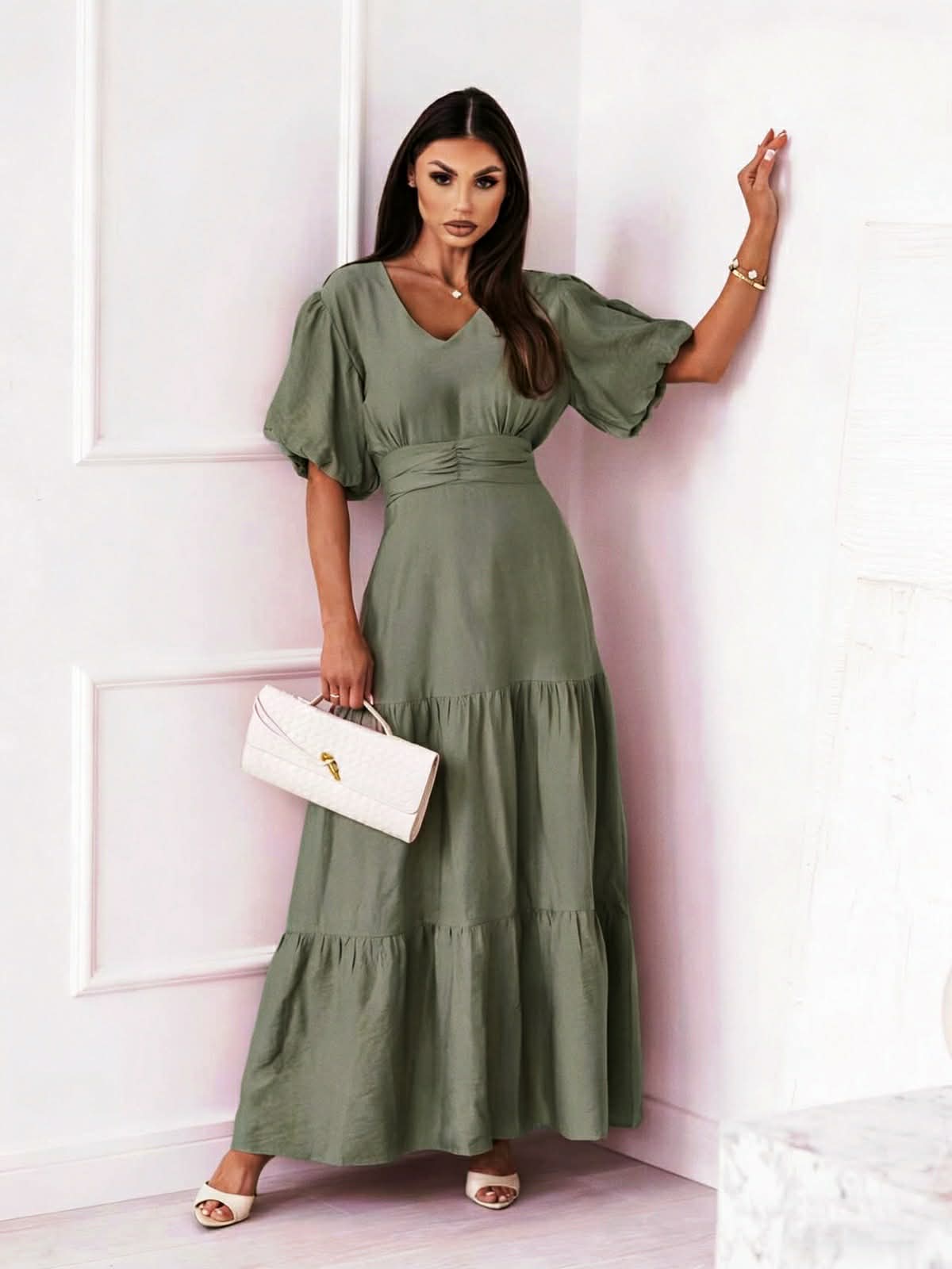 Ρομαντικό και αέρινο maxi φόρεμα που συνδυάζει άνεση και κομψότητα. Τα φουσκωτά μανίκια προσθέτουν χαρακτήρα ενώ η ζώνη στη μέση τονίζει τη σιλουέτα. Η ανάλαφρη γραμμή με διακριτικά βολάν στο τελείωμα δημιουργεί κίνηση σε κάθε βήμα. Ιδανικό για all-day εμφανίσεις με διαχρονική αισθητική.