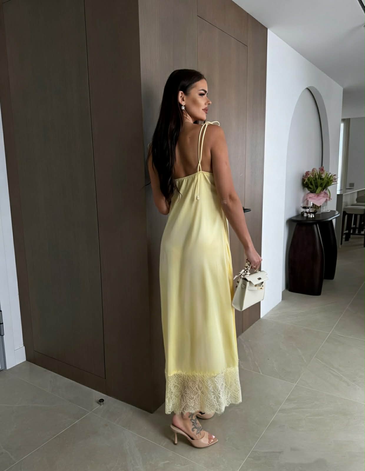 Αέρινο midi φόρεμα με σατινέ υφή με λεπτές τιράντες που δένουν στους ώμους και κομψό ντεκολτέ. Αγκαλιάζει διακριτικά το σώμα ενώ το σκίσιμο στο πόδι προσθέτει θηλυκότητα και κίνηση. Διαθέτει λεπτομέρεια δαντέλας στο τελείωμα για extra ρομαντικό χαρακτήρα. Ιδανικό για εμφανίσεις από το πρωί έως το βράδυ.