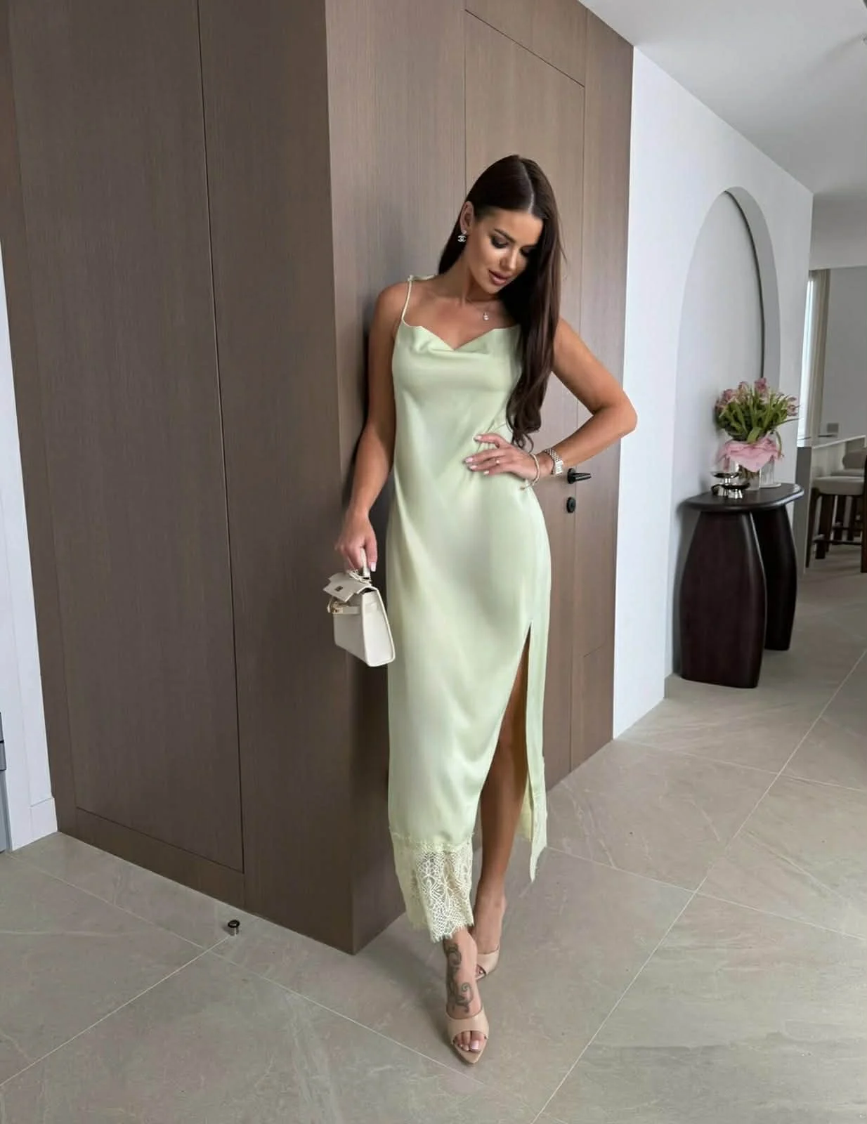 Αέρινο midi φόρεμα με σατινέ υφή με λεπτές τιράντες που δένουν στους ώμους και κομψό ντεκολτέ. Αγκαλιάζει διακριτικά το σώμα ενώ το σκίσιμο στο πόδι προσθέτει θηλυκότητα και κίνηση. Διαθέτει λεπτομέρεια δαντέλας στο τελείωμα για extra ρομαντικό χαρακτήρα. Ιδανικό για εμφανίσεις από το πρωί έως το βράδυ.