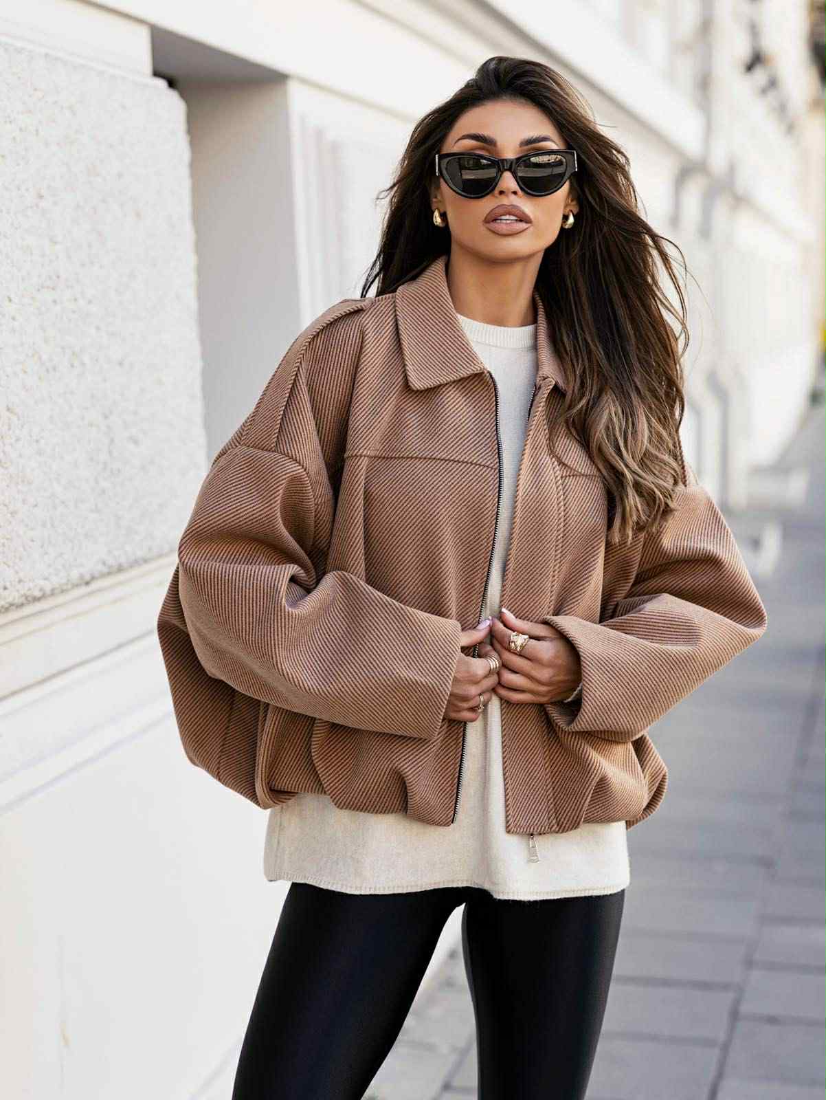 Ένα oversized μπουφάν με υφή τύπου κοτλέ που προσθέτει βάθος και χαρακτήρα στο ύφασμα. Διαθέτει χαλαρή γραμμή με dropped shoulders και φαρδιά μανίκια, προσφέροντας άνεση και στιλ. Το φερμουάρ μπροστά το καθιστά πρακτικό, ενώ ο κλασικός γιακάς δίνει μια κομψή πινελιά. Ιδανικό για καθημερινές εμφανίσεις με urban chic αισθητική, συνδυάζεται εύκολα με leggings, τζιν ή casual σύνολα για ένα μοντέρνο και ζεστό look.