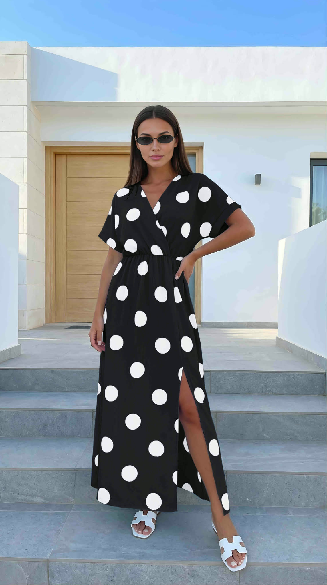 Polka dress εντυπωσιακό σχεδιασμένο για εμφανίσεις με χαρακτήρα. Το διακριτικό άνοιγμα στο πόδι και η αέρινη γραμμή χαρίζουν κίνηση και κομψότητα, κάνοντας το ιδανικό για all day stylish εμφανίσεις. Η μέση διαθέτει λάστιχο για τέλεια εφαρμογή και ανάδειξη της σιλουέτας.