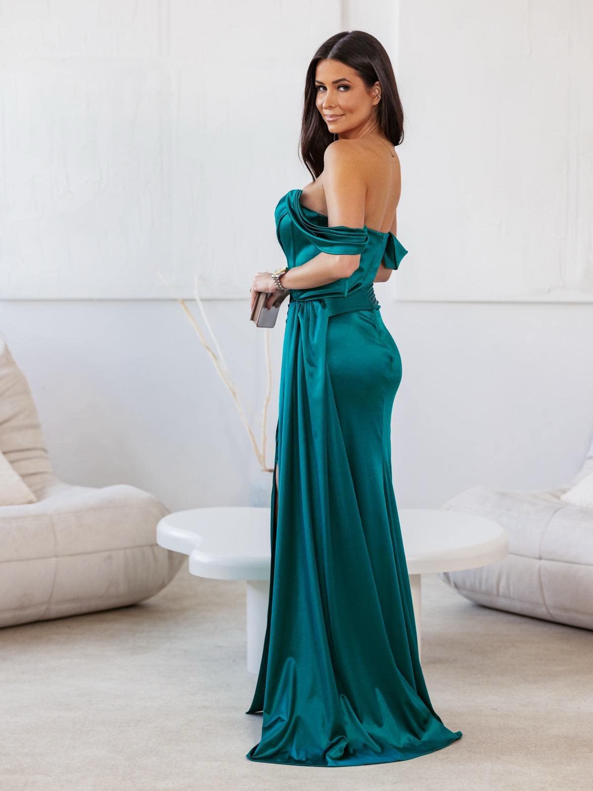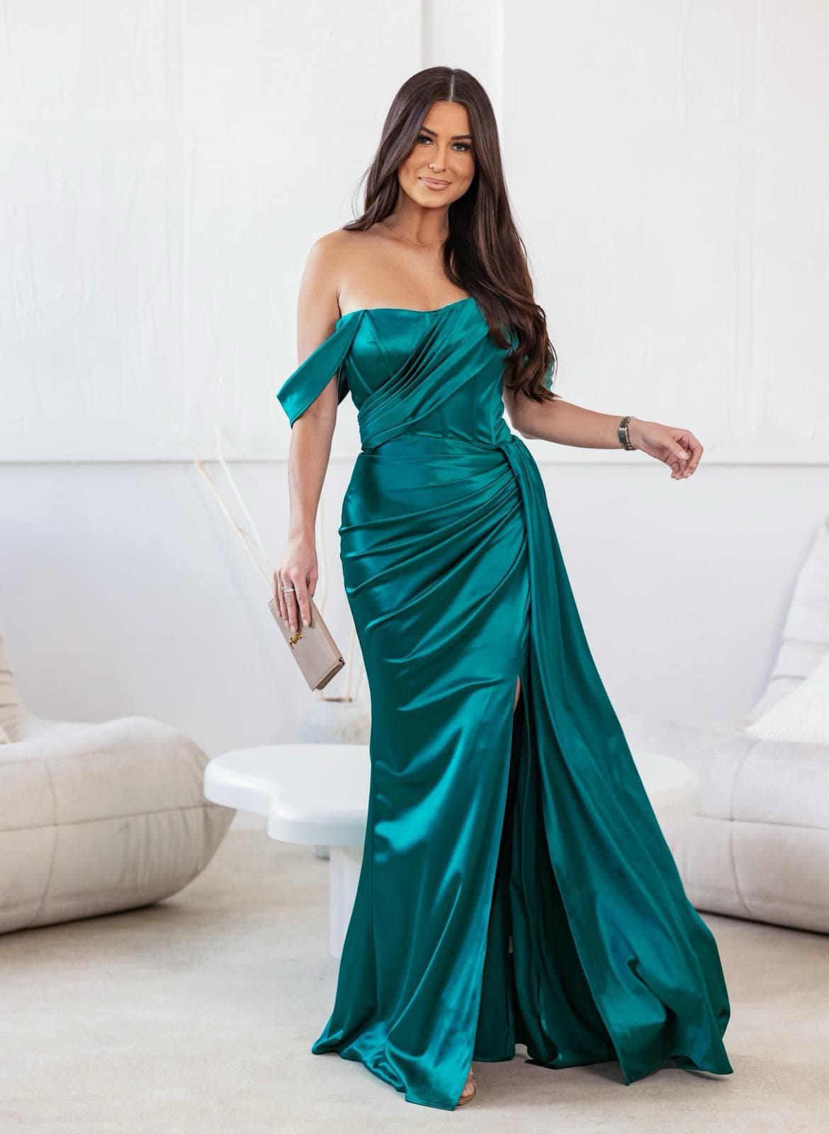 Μάξι τουαλέτα σατινέ έξωμο με σκίσιμο μπροστά.