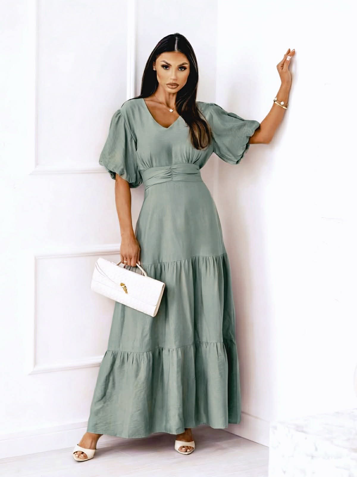 Ρομαντικό και αέρινο maxi φόρεμα που συνδυάζει άνεση και κομψότητα. Τα φουσκωτά μανίκια προσθέτουν χαρακτήρα ενώ η ζώνη στη μέση τονίζει τη σιλουέτα. Η ανάλαφρη γραμμή με διακριτικά βολάν στο τελείωμα δημιουργεί κίνηση σε κάθε βήμα. Ιδανικό για all-day εμφανίσεις με διαχρονική αισθητική.
