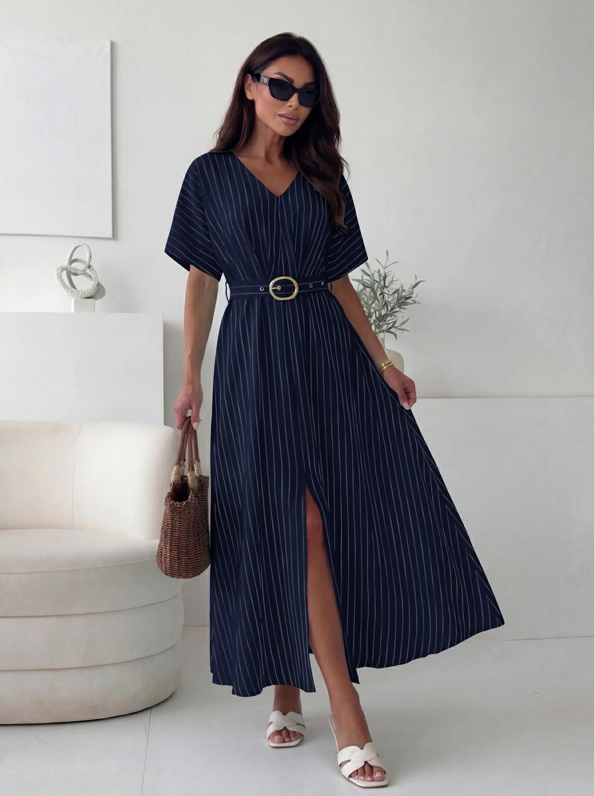 Κομψό και διαχρονικό φόρεμα που αποπνέει minimal αισθητική και θηλυκότητα. Διαθέτει άνετη γραμμή με κοντό μανίκι και V ντεκολτέ, ενώ η κάθετη ρίγα κολακεύει τη σιλουέτα χαρίζοντας ύψος και κομψότητα. Η ζώνη περιλαμβάνεται και αγκαλιάζει τη μέση, τονίζοντας τη γραμμή του σώματος και προσθέτοντας μία elegant πινελιά στο σύνολο. Το ανάλαφρο ύφασμα και η αέρινη κίνηση του φορέματος το καθιστούν ιδανικό για καθημερινές αλλά και πιο προσεγμένες εμφανίσεις. Το διακριτικό σκίσιμο στο μπροστινό μέρος προσφέρει άνεση και θηλυκό χαρακτήρα, ενώ συνδυάζεται εύκολα με σανδάλια ή πέδιλα για ένα ολοκληρωμένο chic look από το πρωί μέχρι το βράδυ.