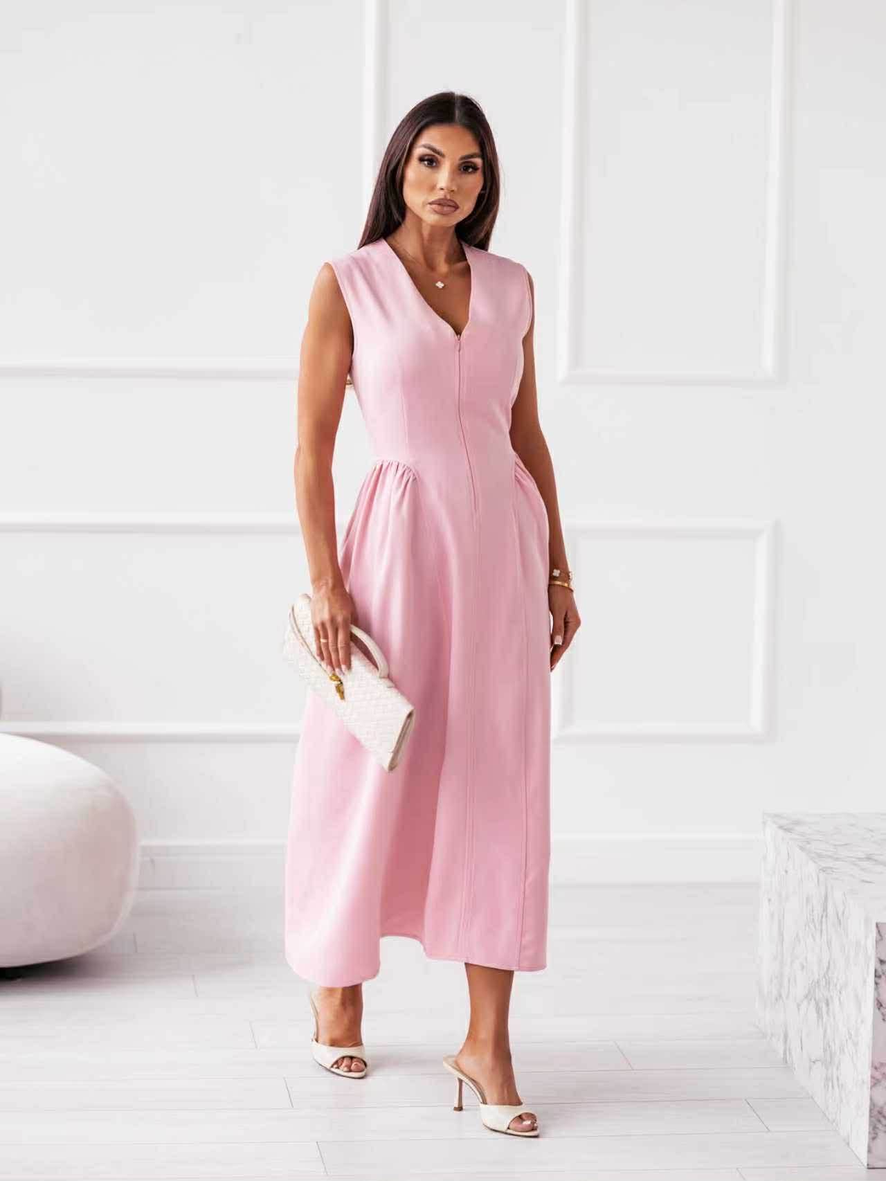 Κομψό midi φόρεμα με minimal αισθητική και διαχρονική γραμμή που αναδεικνύει τη θηλυκότητα με διακριτικό τρόπο. Διαθέτει αμάνικο σχέδιο και καθαρό V ντεκολτέ, ενώ το μπροστινό φερμουάρ προσθέτει σύγχρονο χαρακτήρα και πρακτικότητα. Η εφαρμογή του αγκαλιάζει το σώμα στο επάνω μέρος και ανοίγει απαλά προς τα κάτω, δημιουργώντας μία άνετη και κολακευτική σιλουέτα. Ιδανική επιλογή για εμφανίσεις από το πρωί έως το βράδυ, συνδυάζοντας άνεση και κομψότητα. Ένα versatile κομμάτι που μπορεί να φορεθεί τόσο σε καθημερινές όσο και σε πιο ιδιαίτερες περιστάσεις.