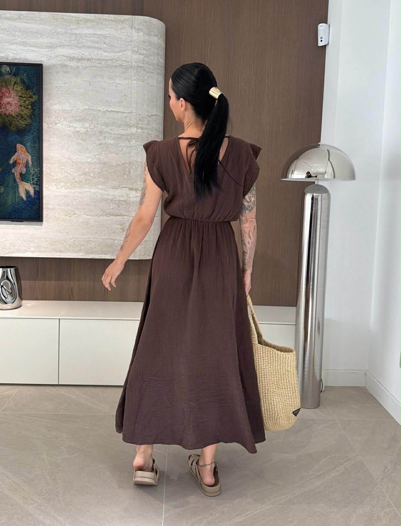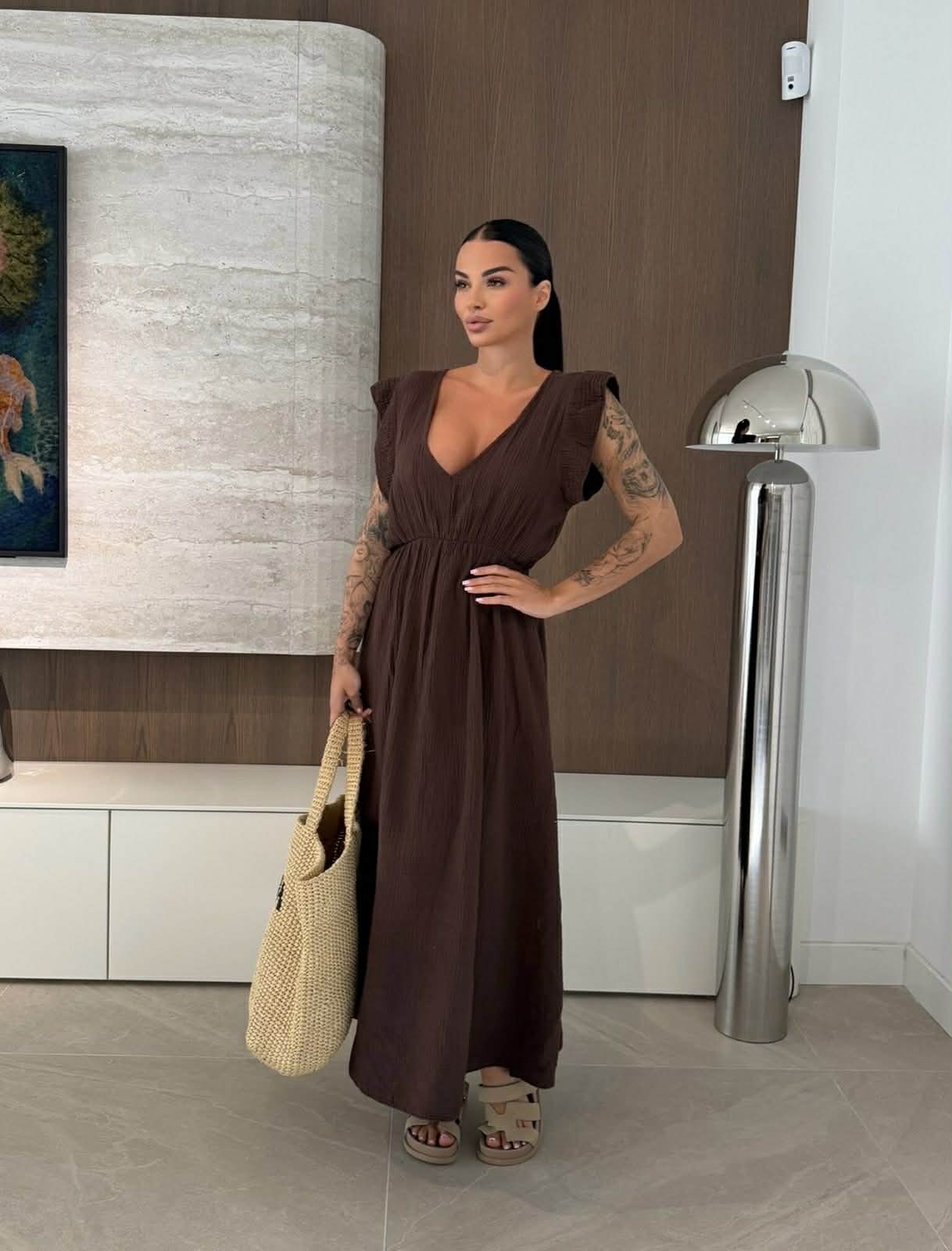 Αέρινο maxi φόρεμα που αποπνέει κομψότητα και άνεση, ιδανικό για κάθε στιγμή της ημέρας. Η θηλυκή V λαιμόκοψη αναδεικνύει το ντεκολτέ, ενώ τα διακριτικά βολάν στους ώμους προσθέτουν μία ρομαντική και κομψή πινελιά. Η μέση αγκαλιάζει το σώμα και δημιουργεί όμορφη σιλουέτα, ενώ η ανάλαφρη γραμμή του φορέματος χαρίζει κίνηση και ελευθερία. Η ανοιχτή πλάτη με διακριτικό δέσιμο ολοκληρώνει το σχέδιο με μία stylish λεπτομέρεια που ξεχωρίζει.