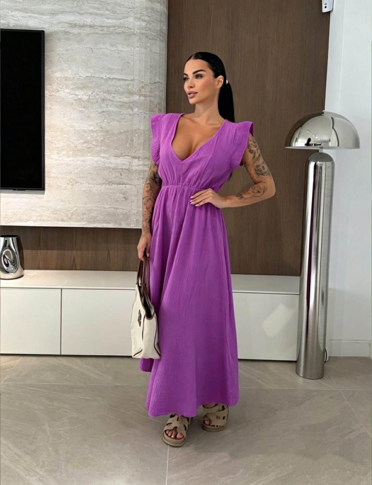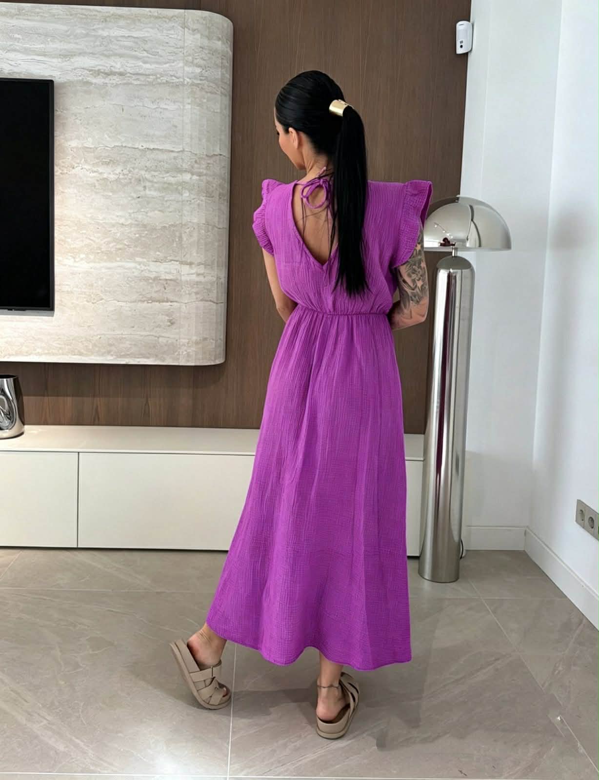 Αέρινο maxi φόρεμα που αποπνέει κομψότητα και άνεση, ιδανικό για κάθε στιγμή της ημέρας. Η θηλυκή V λαιμόκοψη αναδεικνύει το ντεκολτέ, ενώ τα διακριτικά βολάν στους ώμους προσθέτουν μία ρομαντική και κομψή πινελιά. Η μέση αγκαλιάζει το σώμα και δημιουργεί όμορφη σιλουέτα, ενώ η ανάλαφρη γραμμή του φορέματος χαρίζει κίνηση και ελευθερία. Η ανοιχτή πλάτη με διακριτικό δέσιμο ολοκληρώνει το σχέδιο με μία stylish λεπτομέρεια που ξεχωρίζει.