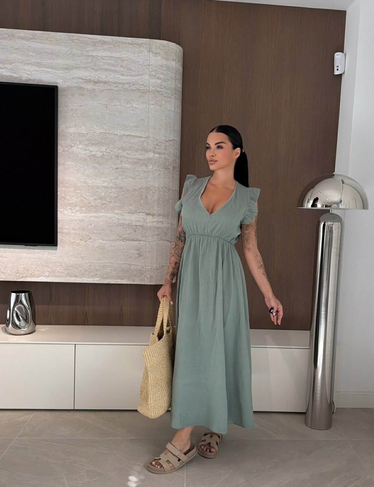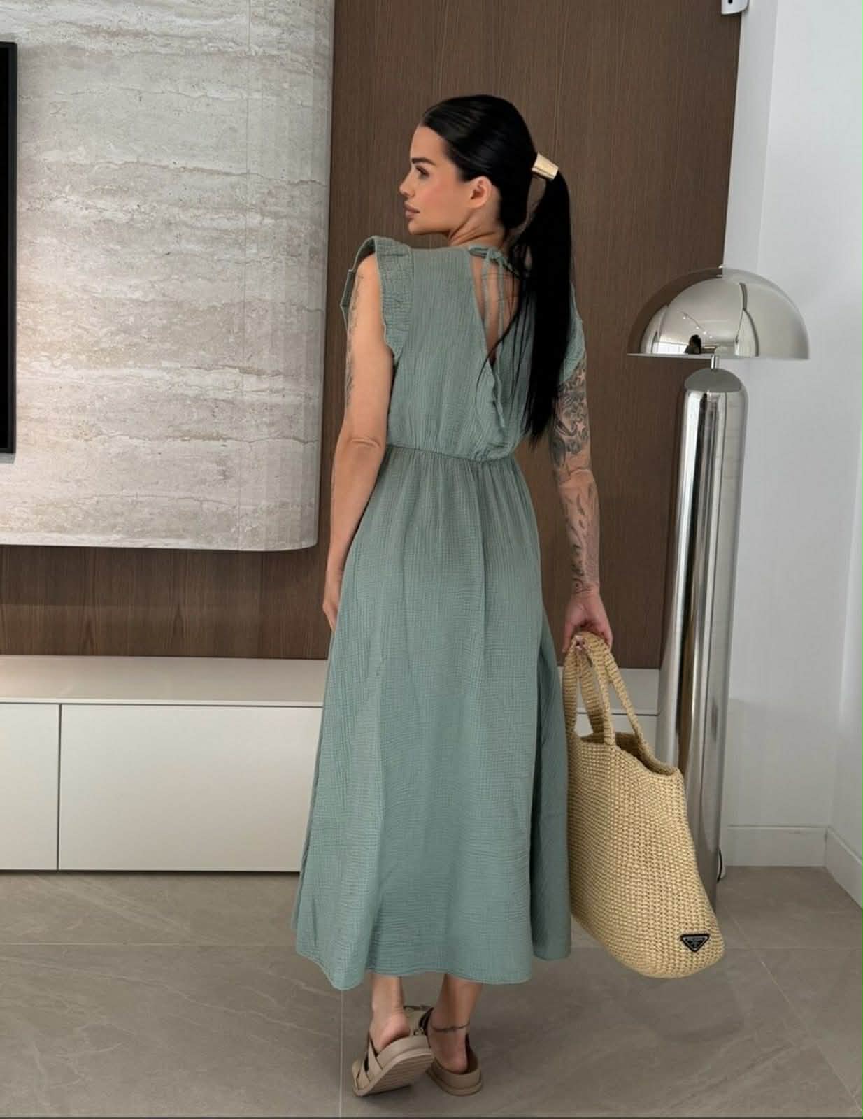 Αέρινο maxi φόρεμα που αποπνέει κομψότητα και άνεση, ιδανικό για κάθε στιγμή της ημέρας. Η θηλυκή V λαιμόκοψη αναδεικνύει το ντεκολτέ, ενώ τα διακριτικά βολάν στους ώμους προσθέτουν μία ρομαντική και κομψή πινελιά. Η μέση αγκαλιάζει το σώμα και δημιουργεί όμορφη σιλουέτα, ενώ η ανάλαφρη γραμμή του φορέματος χαρίζει κίνηση και ελευθερία. Η ανοιχτή πλάτη με διακριτικό δέσιμο ολοκληρώνει το σχέδιο με μία stylish λεπτομέρεια που ξεχωρίζει.