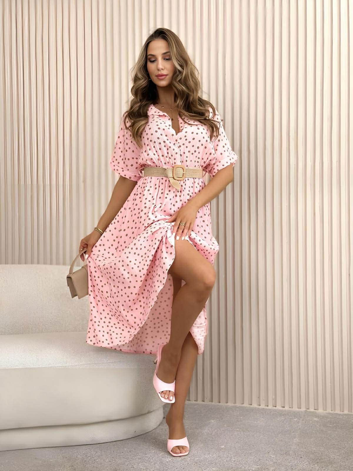Αέρινο και κομψό midi φόρεμα σε γραμμή πουκαμίσου, ιδανικό για καθημερινές αλλά και πιο προσεγμένες εμφανίσεις. Διαθέτει γιακά και κουμπιά στο μπροστινό μέρος, ενώ τα κοντά μανίκια προσφέρουν άνεση και δροσερή αίσθηση. Η ελαστική μέση αγκαλιάζει διακριτικά τη σιλουέτα, ενώ συνοδεύεται από ζώνη που αναδεικνύει το σώμα και ολοκληρώνει το look με στυλ. Το παιχνιδιάρικο μοτίβο προσθέτει θηλυκότητα και χαρακτήρα, κάνοντας το φόρεμα ιδανική επιλογή για κάθε ώρα της ημέρας.