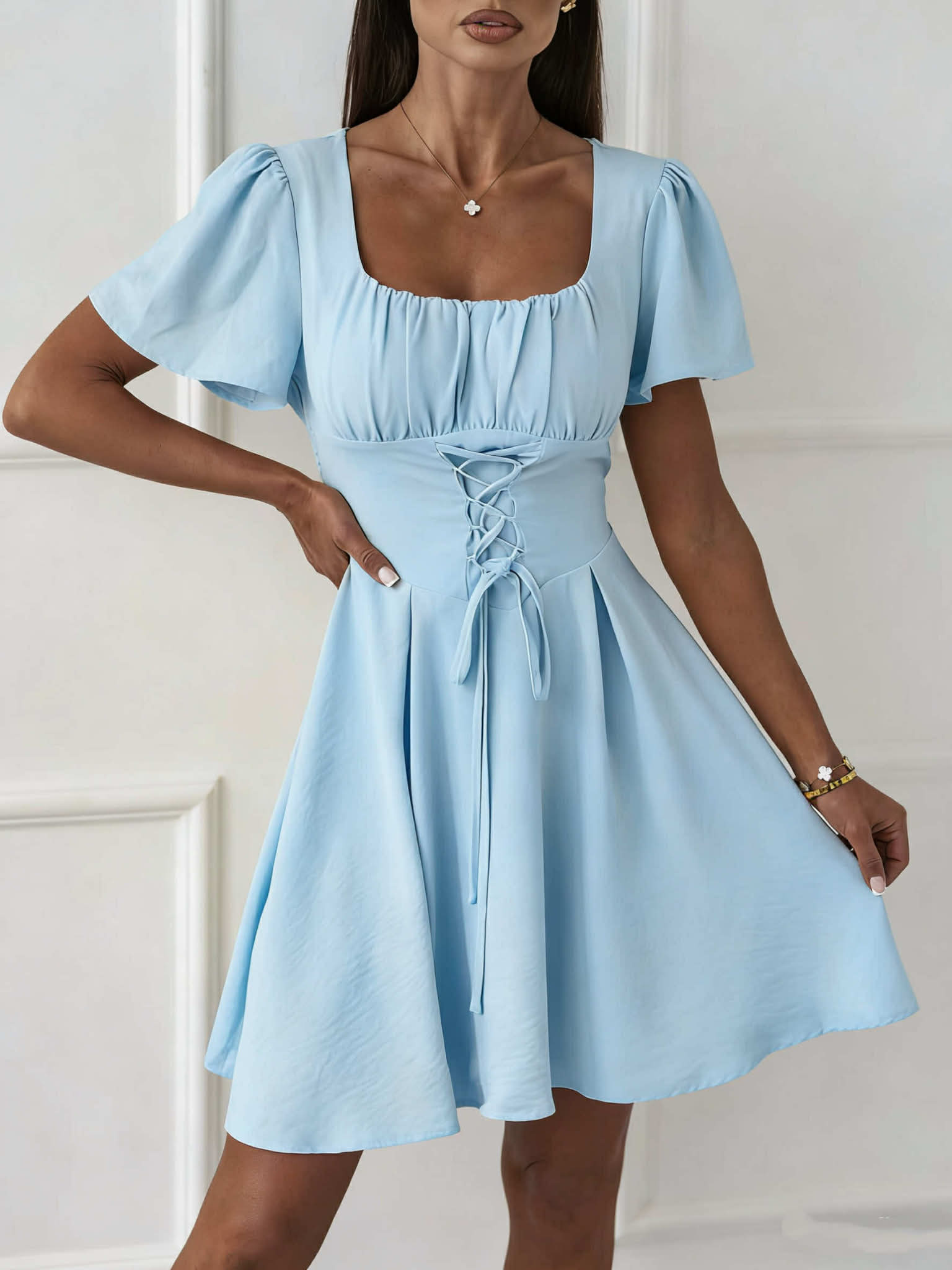 Ανακάλυψε το απόλυτο καλοκαιρινό φόρεμα που συνδυάζει θηλυκότητα και άνεση με μοναδικό τρόπο Αυτό το mini φόρεμα αποπνέει φρεσκάδα και κομψότητα. Το μπούστο με σούρες αγκαλιάζει διακριτικά το σώμα, ενώ το κορσέ δέσιμο στη μέση αναδεικνύει τη σιλουέτα και προσφέρει τέλεια εφαρμογή. Τα κοντά μανίκια με ελαφρύ όγκο χαρίζουν ρομαντική διάθεση, ενώ η αέρινη γραμμή της φούστας δημιουργεί κίνηση σε κάθε σου βήμα. Η ελαστική πλάτη εξασφαλίζει άνεση όλη μέρα, καθιστώντας το ιδανικό για κάθε περίσταση  από πρωινές βόλτες μέχρι βραδινές εξόδους. Συνδύασέ το με πέδιλα ή heels και ολοκλήρωσε το look με minimal αξεσουάρ για effortless chic εμφανίσεις.