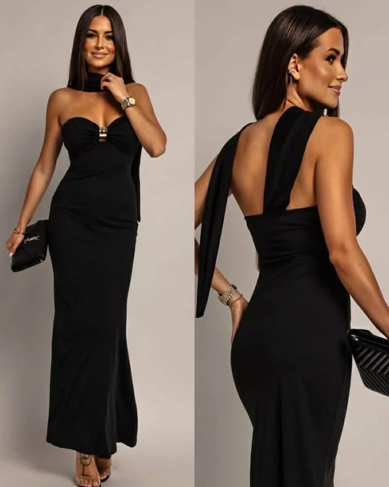 Κομψό φόρεμα που αγκαλιάζει μοναδικά τη σιλουέτα. Διαθέτει στραπλες σχέδιο με διακριτική σούερα στο μπούστο και χρυσό διακοσμητικό στοιχείο στο κέντρο που προσθέτει μια glamorous πινελιά. Το ιδιαίτερο ύφασμα που δένει στο λαιμό δημιουργεί ένα κομψό εφέ ενώ η εφαρμογή του αναδεικνύει τη θηλυκότητα. Ιδανική επιλογή για βραδινές εμφανίσεις, events και ιδιαίτερες περιστάσεις.
