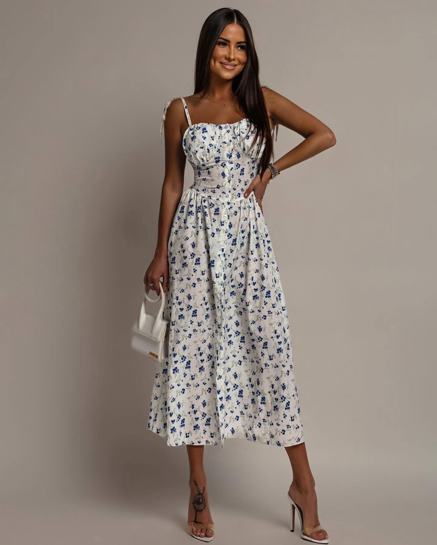 Φλοραλ φόρεμα τιραντέ με κουμπιά και σκίσιμο μπροστά.