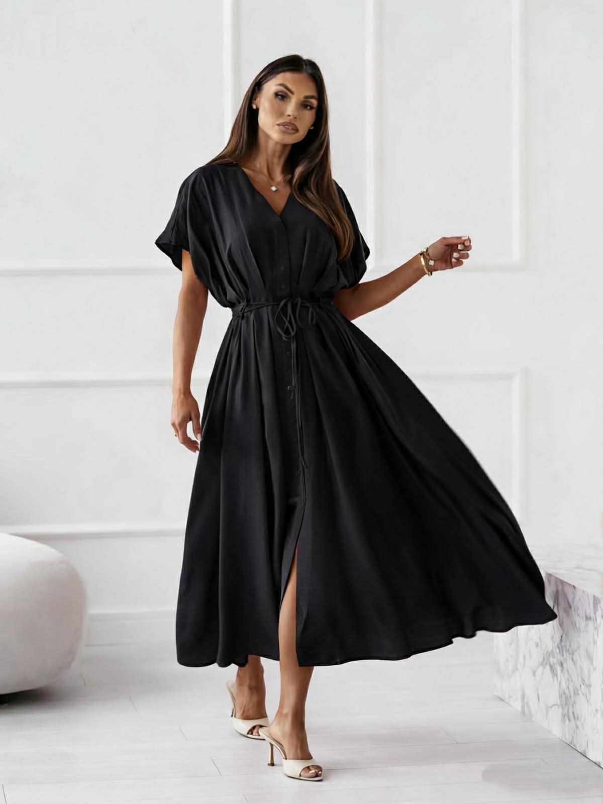 Αέρινο και κομψό, αυτό το φόρεμα συνδυάζει άνεση και θηλυκότητα σε κάθε του λεπτομέρεια. Η χαλαρή γραμμή στο επάνω μέρος αγκαλιάζει απαλά το σώμα, ενώ η ζώνη στη μέση τονίζει διακριτικά τη σιλουέτα, δημιουργώντας μία ισορροπημένη και κολακευτική εφαρμογή. Το V ντεκολτέ και τα κουμπιά στο μπροστινό μέρος προσθέτουν μία διαχρονική πινελιά, ενώ η ανάλαφρη φούστα με το σκίσιμο χαρίζει κίνηση και κομψότητα σε κάθε βήμα. Τα κοντά, ριχτά μανίκια ολοκληρώνουν το σύνολο, προσφέροντας άνεση και στυλ όλη μέρα. Ιδανική επιλογή για εμφανίσεις από το πρωί έως το βράδυ, συνδυάζεται εύκολα με σανδάλια ή πέδιλα για ένα σύγχρονο και ανεπιτήδευτα chic αποτέλεσμα.