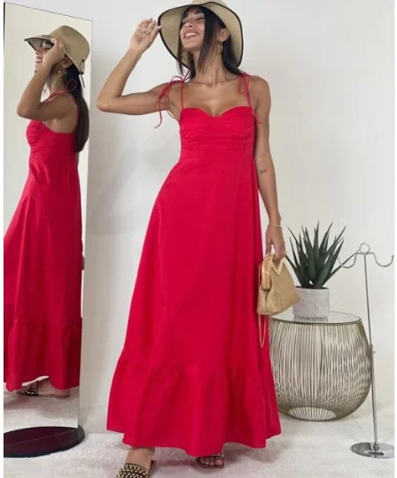Midi φόρεμα με κορδονάκια στους ώμους. Στην πλάτη διαθέτει σφηκοφωλιά.