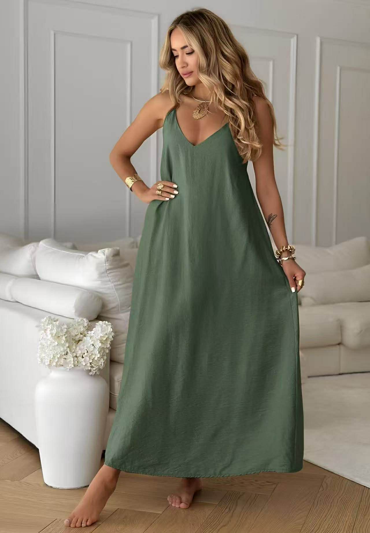 Αέρινο maxi φόρεμα που συνδυάζει άνεση και κομψότητα σε κάθε σου εμφάνιση. Με χαλαρή, ρευστή γραμμή που αγκαλιάζει το σώμα χωρίς να το περιορίζει, αποτελεί την ιδανική επιλογή για effortless καλοκαιρινό στυλ. Η minimal αισθητική του απογειώνεται με το διακριτικό V ντεκολτέ και τις λεπτές τιράντες, ενώ η εντυπωσιακή ανοιχτή πλάτη με διακριτικό δέσιμο προσθέτει μία θηλυκή και sophisticated πινελιά. Το ύφασμα χαρίζει ανάλαφρη κίνηση, ιδανική για όλες τις ώρες της ημέρας – από πρωινές βόλτες μέχρι βραδινές εξόδους.