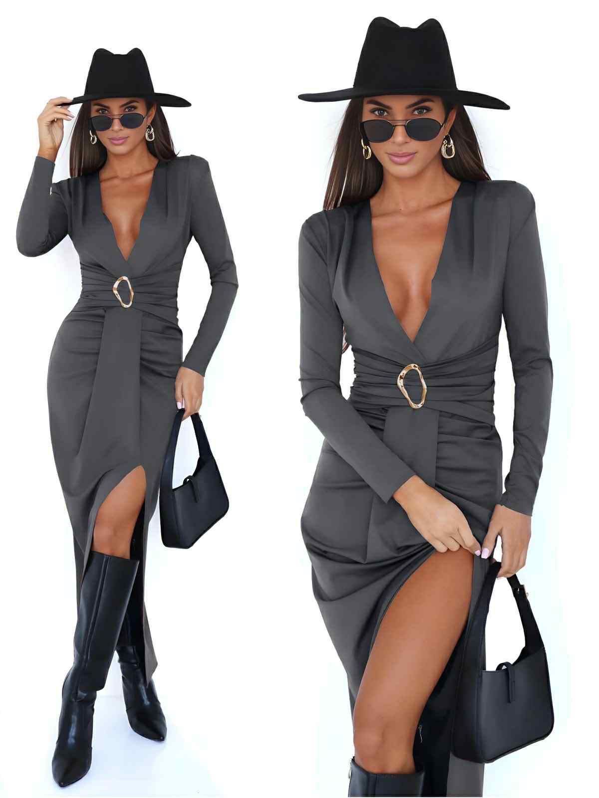 Μαξι φόρεμα με σκίσιμο στο πόδι, ανοιχτό ντεκολτέ και διακοσμητικό στην μέση. Φόρεσε το με ψηλοτάκουνι μπότα για να εντυπωσιάσεις.