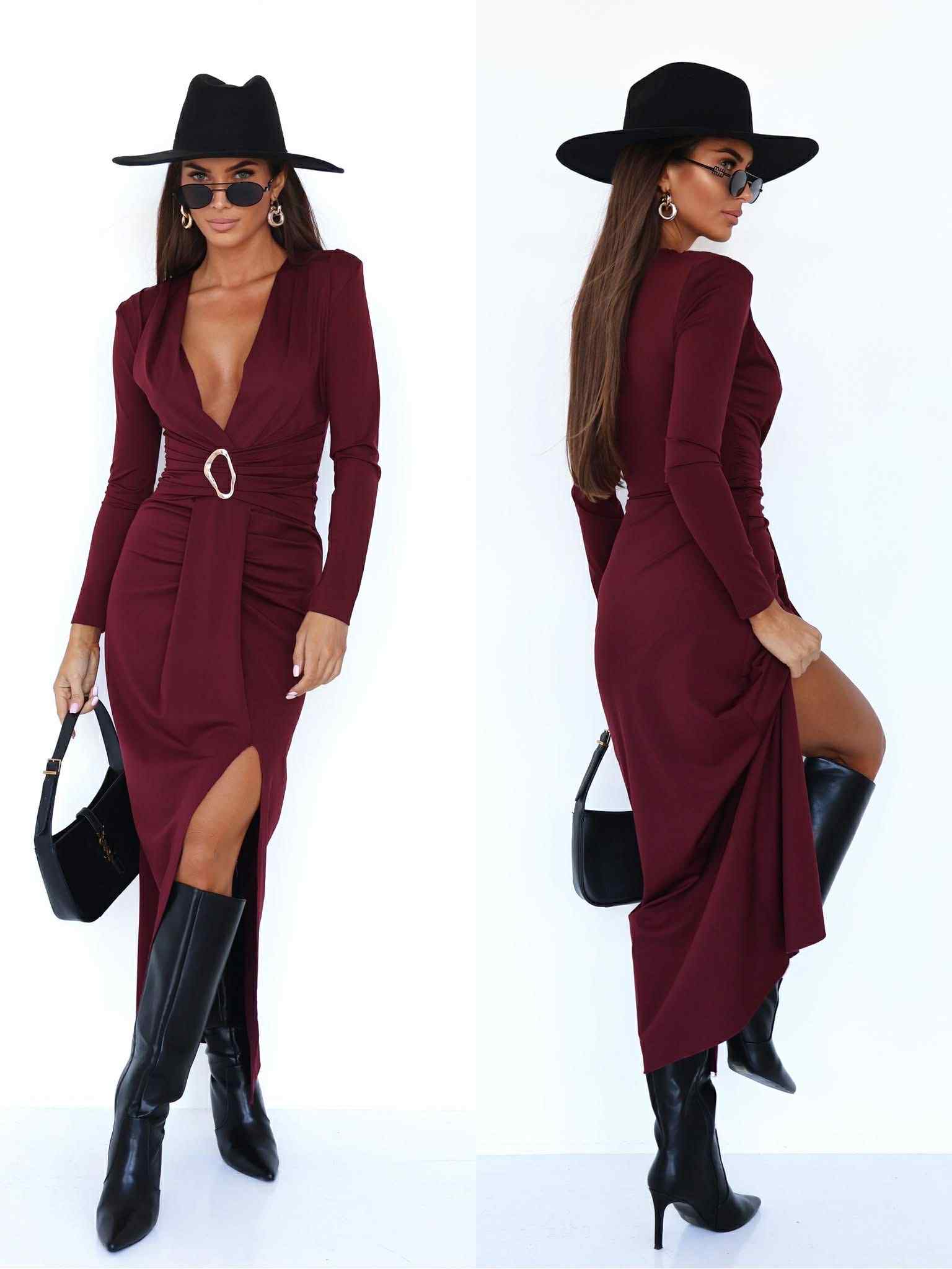 Μαξι φόρεμα με σκίσιμο στο πόδι, ανοιχτό ντεκολτέ και διακοσμητικό στην μέση. Φόρεσε το με ψηλοτάκουνι μπότα για να εντυπωσιάσεις.