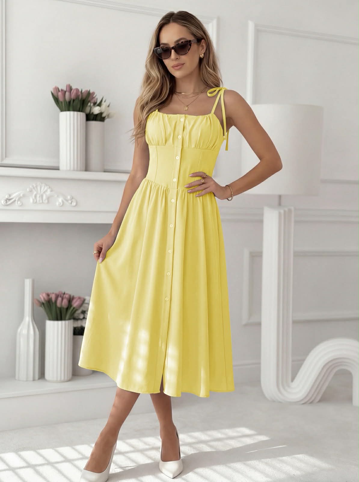 Ανακάλυψε την απόλυτη ισορροπία ανάμεσα στη ρομαντική κομψότητα και τη σύγχρονη θηλυκότητα Αυτό το midi φόρεμα με τιράντες και διακριτικό δέσιμο στους ώμους χαρίζει μία φίνα και καλοκαιρινή αισθητική. Το μπούστο με σούρες και τα κουμπιά στο μπροστινό μέρος προσθέτουν μία κομψή, διαχρονική πινελιά, ενώ η εφαρμοστή μέση αναδεικνύει τη σιλουέτα με φυσικό τρόπο. Η αέρινη φούστα σε Α γραμμή προσφέρει κίνηση και άνεση, καθιστώντας το ιδανικό για κάθε στιγμή της ημέρας από πρωινές βόλτες μέχρι πιο προσεγμένες εμφανίσεις. Συνδύασέ το με γόβες ή σανδάλια και minimal κοσμήματα για ένα elegant & effortless look.