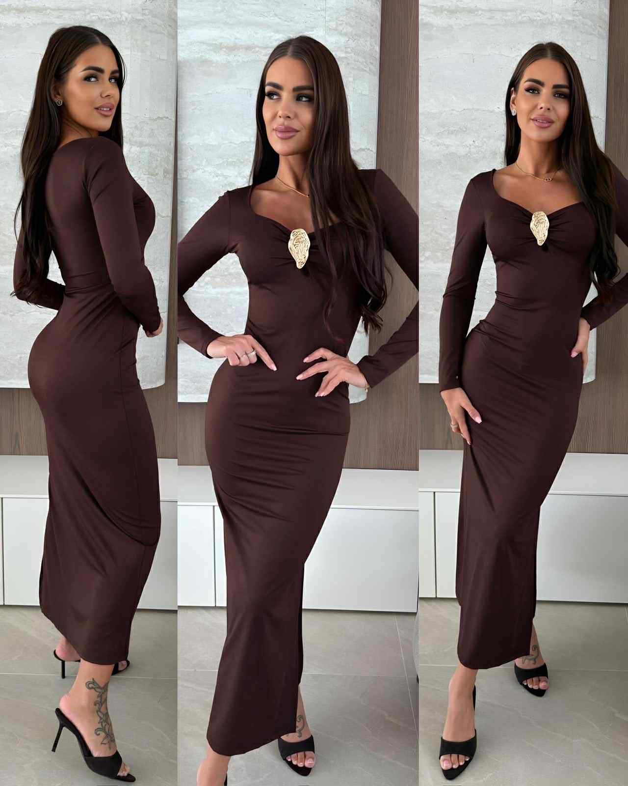 Εντυπωσιακό μάξι φόρεμα, σχεδιασμένο να αγκαλιάζει τη σιλουέτα με κομψότητα. Διαθέτει μακριά μανίκια και εφαρμοστή γραμμή που προσφέρει θηλυκό και εκλεπτυσμένο στυλ. Το μπούστο είναι ενισχυμένο με cups για καλύτερη εφαρμογή και στήριξη, ενώ το διακοσμητικό στοιχείο στο κέντρο προσθέτει μια statement πινελιά που τραβά τα βλέμματα. Η διακριτική σκίση στο κάτω μέρος εξασφαλίζει άνεση στην κίνηση και διακριτική γοητεία.Ιδανικό για βραδινές εμφανίσεις, εκδηλώσεις ή ιδιαίτερες περιστάσεις, αυτό το φόρεμα συνδυάζει απλότητα και πολυτέλεια με διακριτικό αλλά δυναμικό χαρακτήρα.