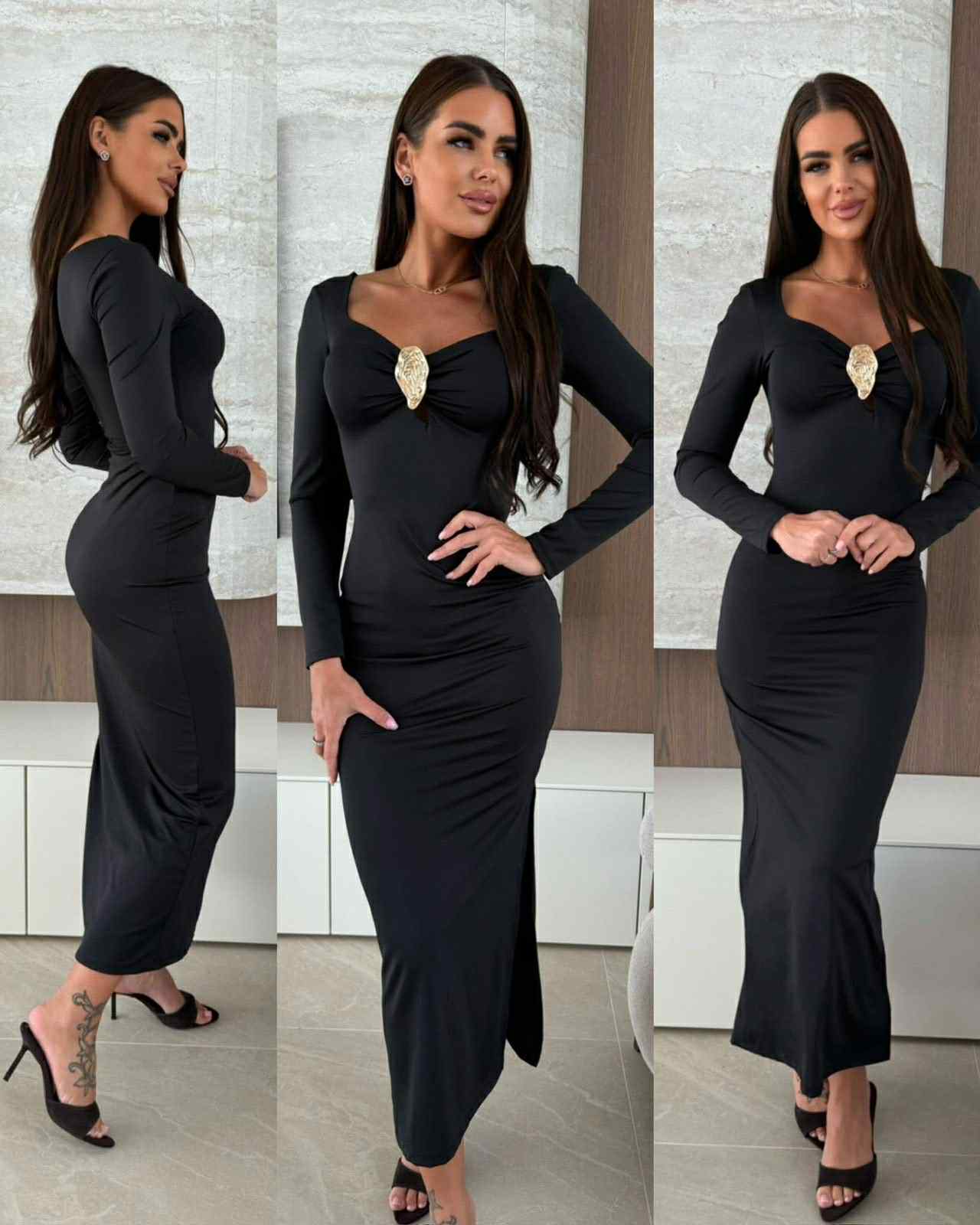 Εντυπωσιακό μάξι φόρεμα, σχεδιασμένο να αγκαλιάζει τη σιλουέτα με κομψότητα. Διαθέτει μακριά μανίκια και εφαρμοστή γραμμή που προσφέρει θηλυκό και εκλεπτυσμένο στυλ. Το μπούστο είναι ενισχυμένο με cups για καλύτερη εφαρμογή και στήριξη, ενώ το διακοσμητικό στοιχείο στο κέντρο προσθέτει μια statement πινελιά που τραβά τα βλέμματα. Η διακριτική σκίση στο κάτω μέρος εξασφαλίζει άνεση στην κίνηση και διακριτική γοητεία.Ιδανικό για βραδινές εμφανίσεις, εκδηλώσεις ή ιδιαίτερες περιστάσεις, αυτό το φόρεμα συνδυάζει απλότητα και πολυτέλεια με διακριτικό αλλά δυναμικό χαρακτήρα.