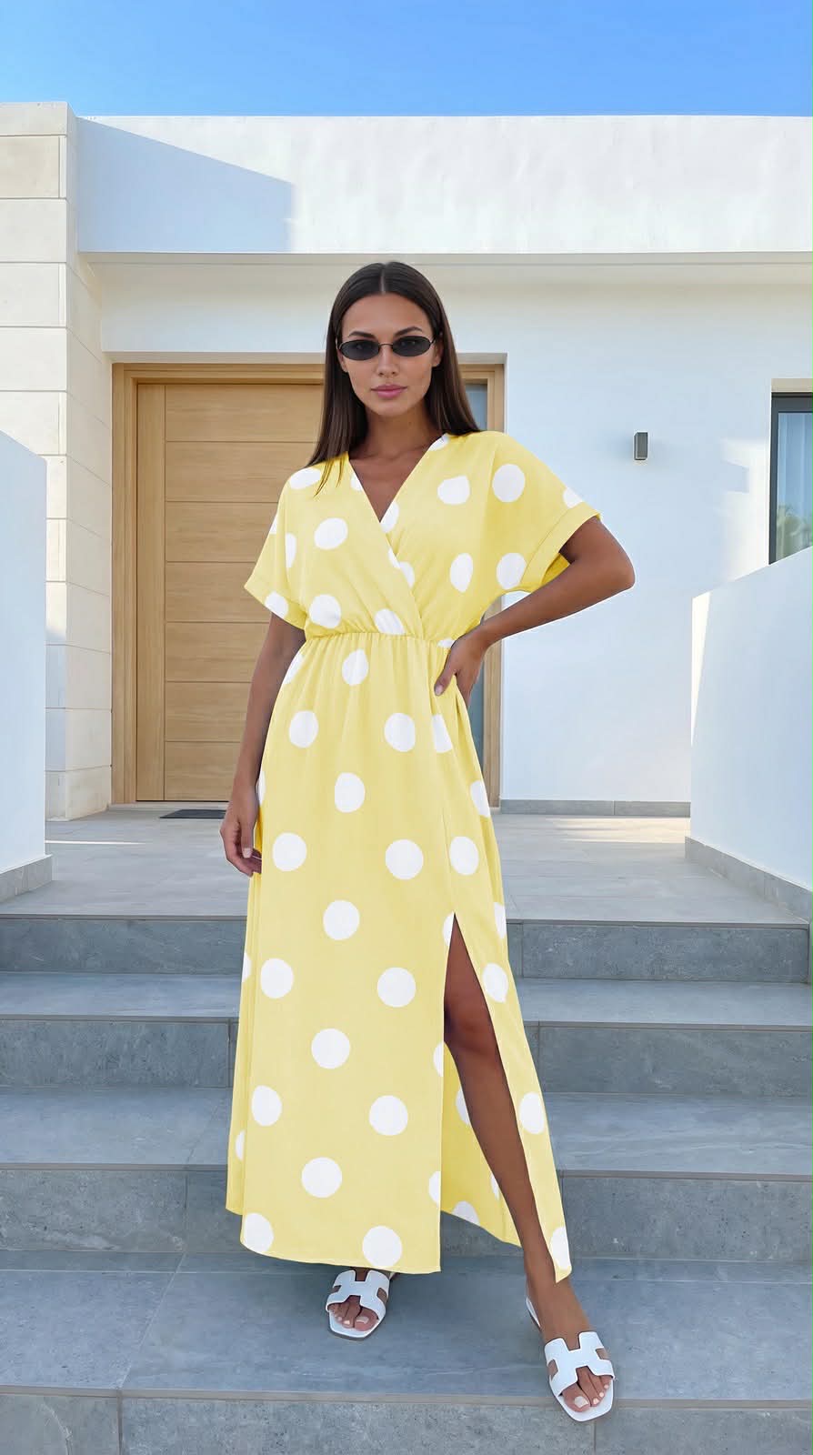 Polka dress εντυπωσιακό σχεδιασμένο για εμφανίσεις με χαρακτήρα. Το διακριτικό άνοιγμα στο πόδι και η αέρινη γραμμή χαρίζουν κίνηση και κομψότητα, κάνοντας το ιδανικό για all day stylish εμφανίσεις. Η μέση διαθέτει λάστιχο για τέλεια εφαρμογή και ανάδειξη της σιλουέτας.