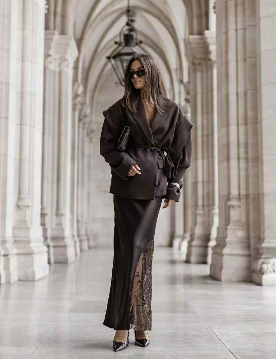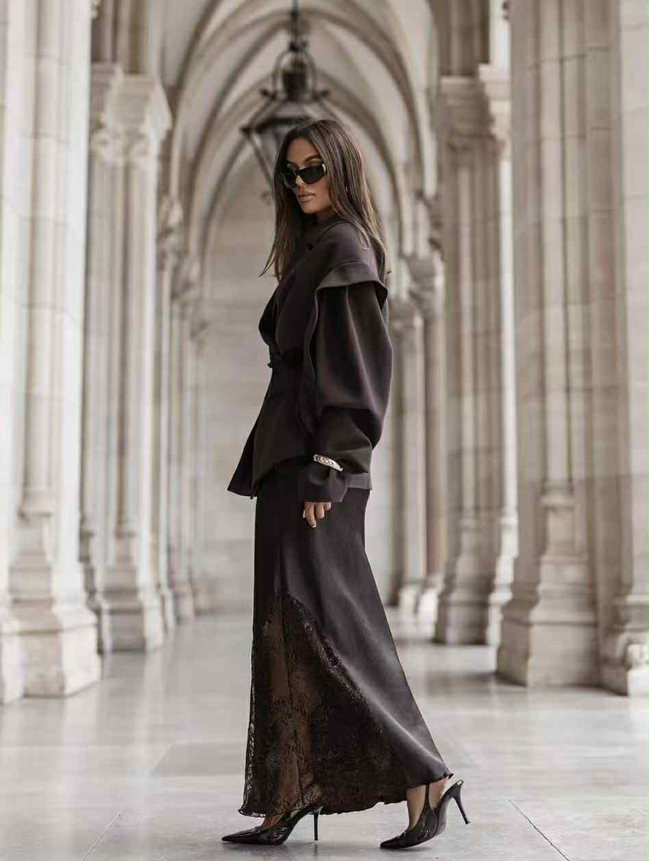 Κομψή και αέρινη μάξι φούστα από σατινέ ύφασμα και δαντέλα στην μια πλευρά που χαρίζει πολυτελή λάμψη και θηλυκότητα. Διαθέτει λάστιχο στη μέση για άνεση και τέλεια εφαρμογή, ενώ η ρευστή γραμμή της κολακεύει κάθε σιλουέτα. Ένα διαχρονικό κομμάτι που μπορεί να φορεθεί τόσο σε καθημερινές chic εμφανίσεις όσο και σε πιο ιδιαίτερες περιστάσεις.