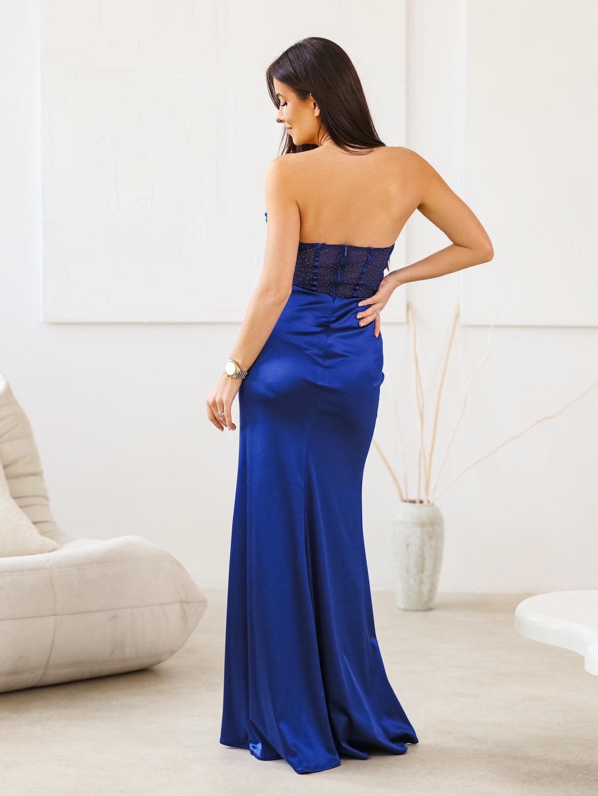 Μάξι τουαλέτα σατινέ στράπλες με διαφάνεια και στρασάκια στο μπούστο διαθέτει ενίσχυση. Στο πόδι διαθέτει άνοιγμα με διαφάνεια και στρασάκια και κλείνει με φερμουάρ στην πλάτη.