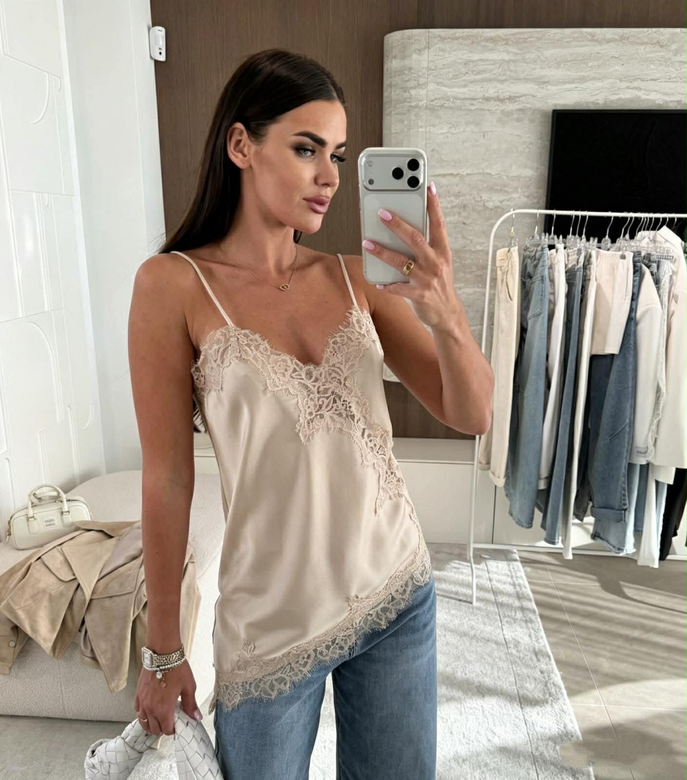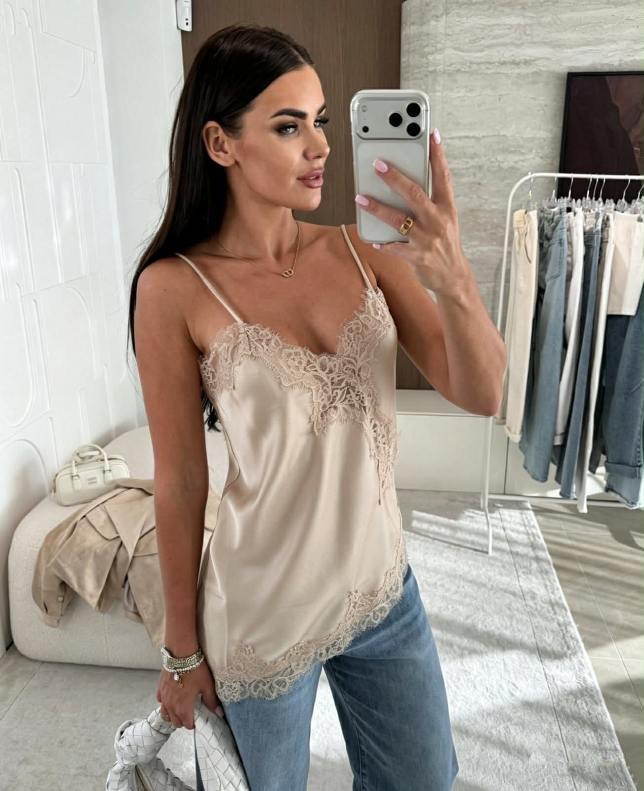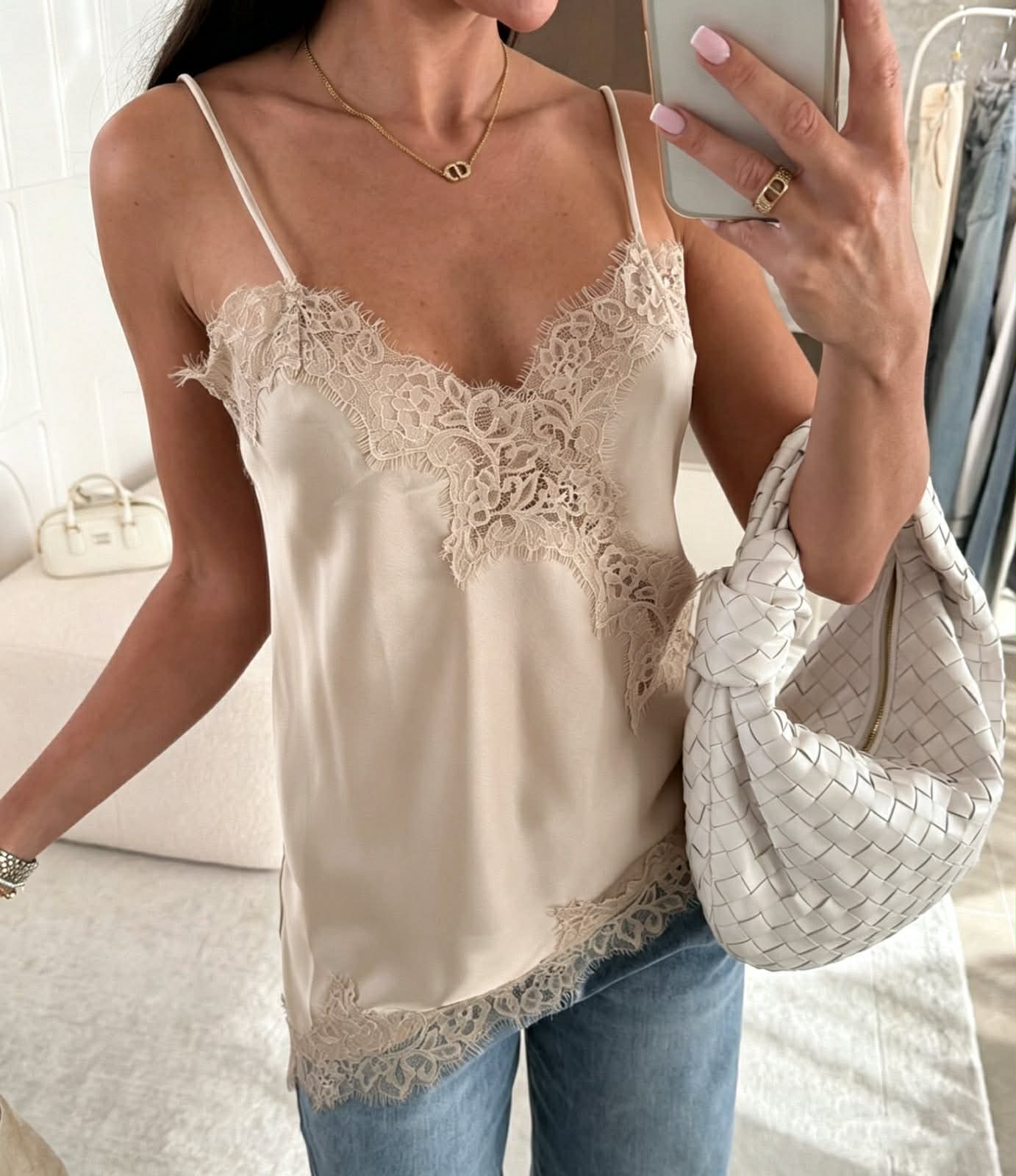 Αναβάθμισε το στυλ σου με αυτή τη φίνα μπλούζα τύπου lingerie που αποπνέει κομψότητα και διακριτική θηλυκότητα. Οι λεπτές τιράντες και η απαλή σατέν υφή αγκαλιάζουν το σώμα, χαρίζοντας μία αίσθηση πολυτέλειας σε κάθε εμφάνιση. Η δαντελένια λεπτομέρεια στο ντεκολτέ και στο τελείωμα προσθέτει ρομαντικό χαρακτήρα, ενώ η ανάλαφρη γραμμή την καθιστά ιδανική για effortless chic looks. Φοριέται εύκολα από το πρωί έως το βράδυ, είτε με jeans για casual εμφανίσεις είτε με πιο elegant κομμάτια για βραδινές εξόδους.