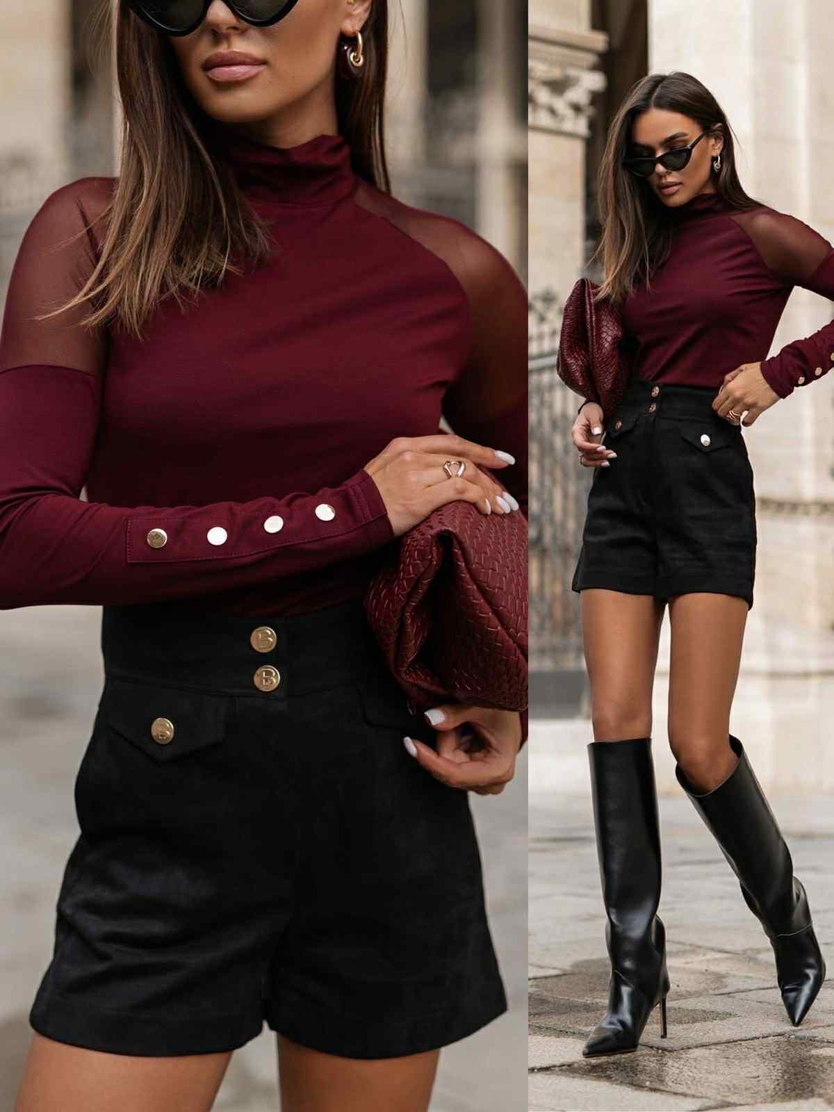Αναβάθμισε το στυλ σου με αυτό το υπέροχο κορμάκι. Διαθέτει λεπτομέρειες διαφάνειας στα μανίκια που προσθέτουν μια διακριτική δόση θηλυκότητας και κομψότητας, ενώ τα χρυσά κουμπιά στους καρπούς δίνουν μια πολυτελή πινελιά. Η εφαρμογή του αγκαλιάζει αρμονικά το σώμα, αναδεικνύοντας τη σιλουέτα με εκλεπτυσμένο τρόπο. Συνδύασέ το με ψηλόμεσο σορτς, μίνι φούστα ή ψηλόμεσο παντελόνι για ένα chic, urban look από το πρωί μέχρι το βράδυ.