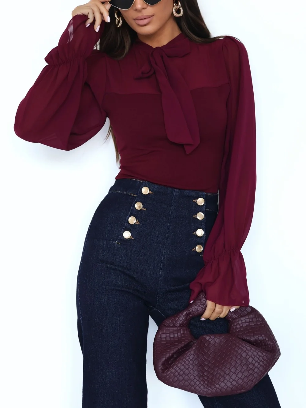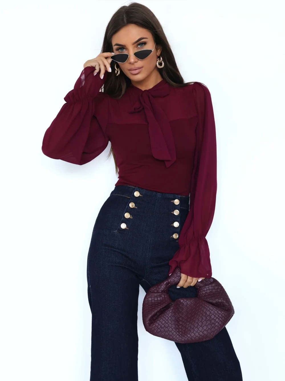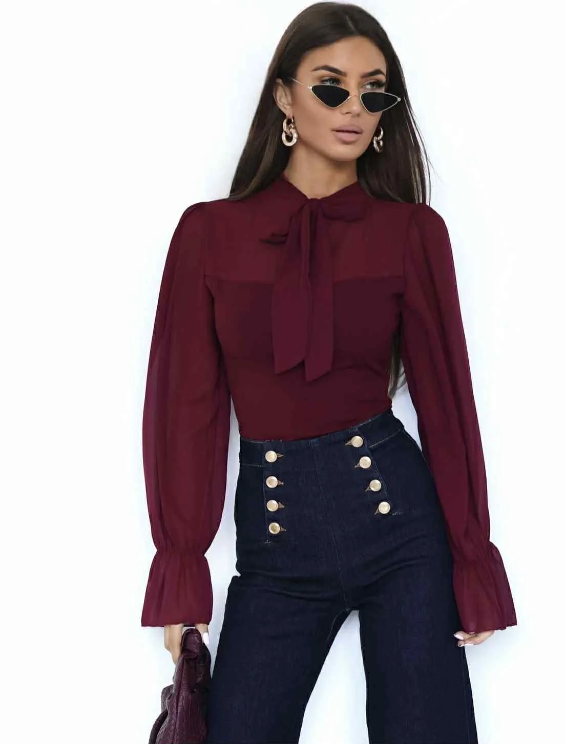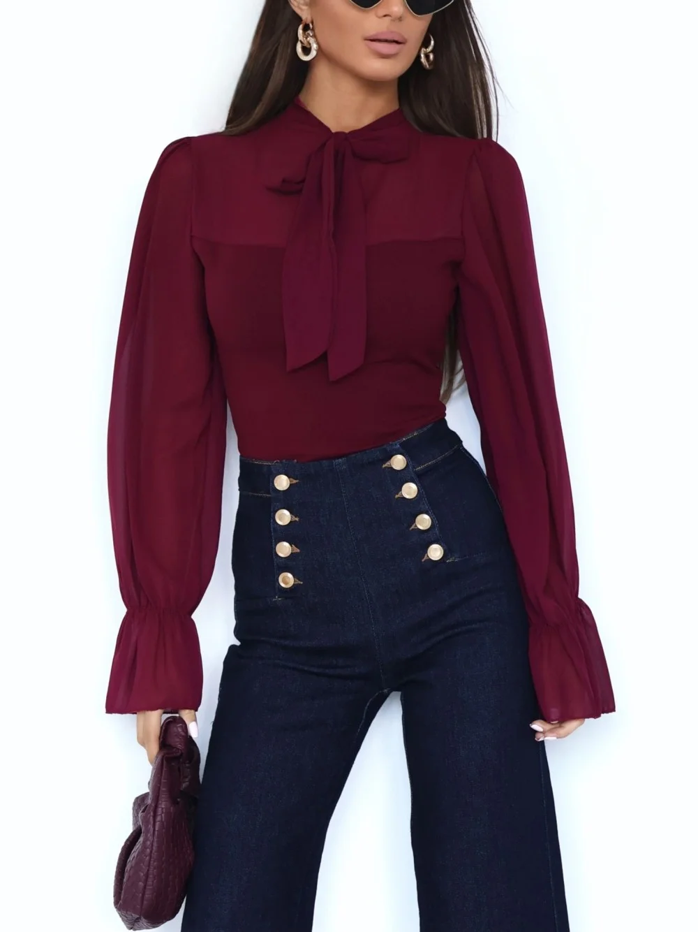 Αναδείξτε τη σιλουέτα σας με αυτήν την κομψή, μακρυμάνικη μπλούζα. Αγκαλιάζει το σώμα, προσφέροντας άνεση και στυλ. Το απόλυτο σημείο εστίασης είναι ο φιόγκος που δένει στον λαιμό και οι διαφάνεια στα μανίκια η οποία δημιουργεί και προσθέτει έναν αέρα πολυτέλειας και θηλυκότητας. Είτε ψάχνετε για ένα σικ τοπ για μια βραδινή έξοδο, είτε για ένα διαχρονικό κομμάτι που θα αναβαθμίσει το office look σας, αυτή η μπλούζα είναι η ιδανική επιλογή. Συνδυάστε την με ψηλόμεσο παντελόνι ή φούστα για ένα ολοκληρωμένο και εντυπωσιακό σύνολο.