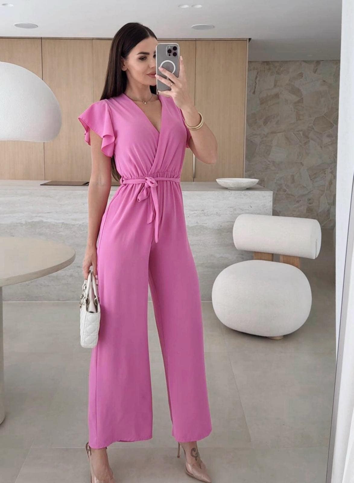 Ολόσωμη φόρμα με βολάν στους ώμους και ζωνάκι απο το ίδιο ύφασμα. Στη μέση διαθέτει λάστιχο.