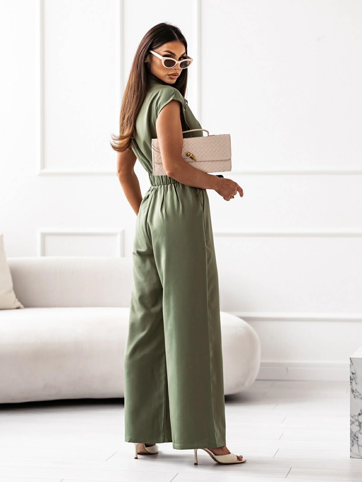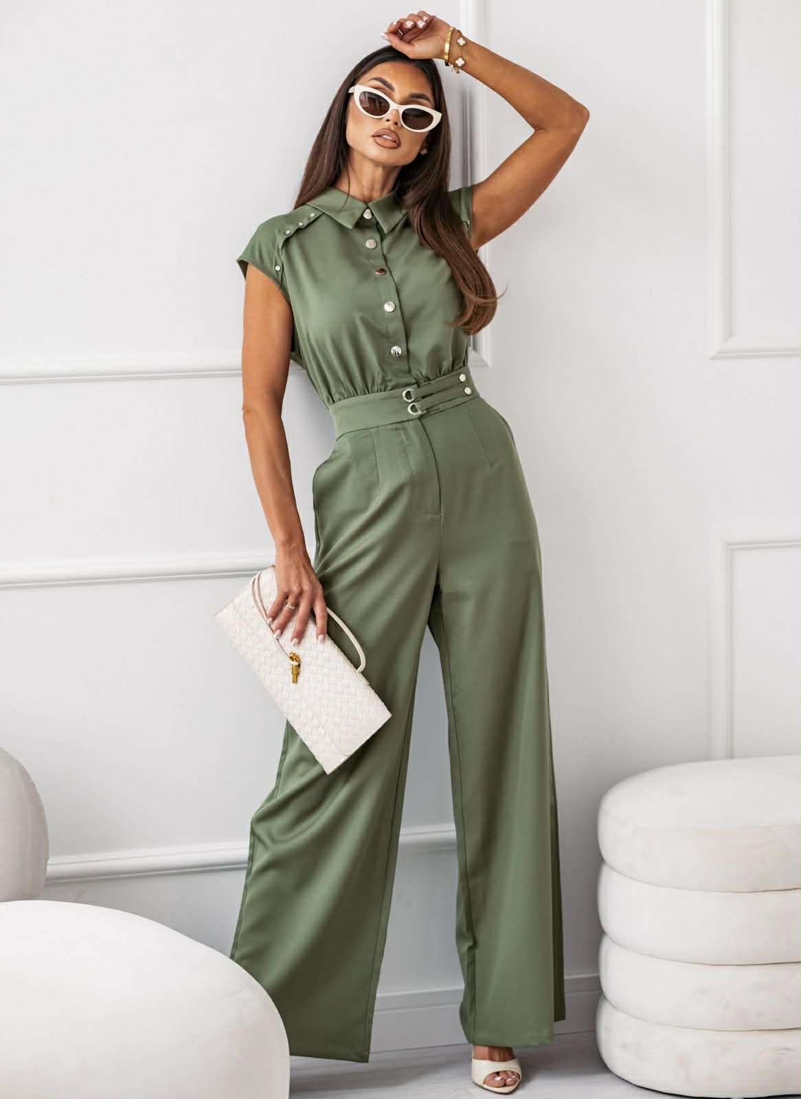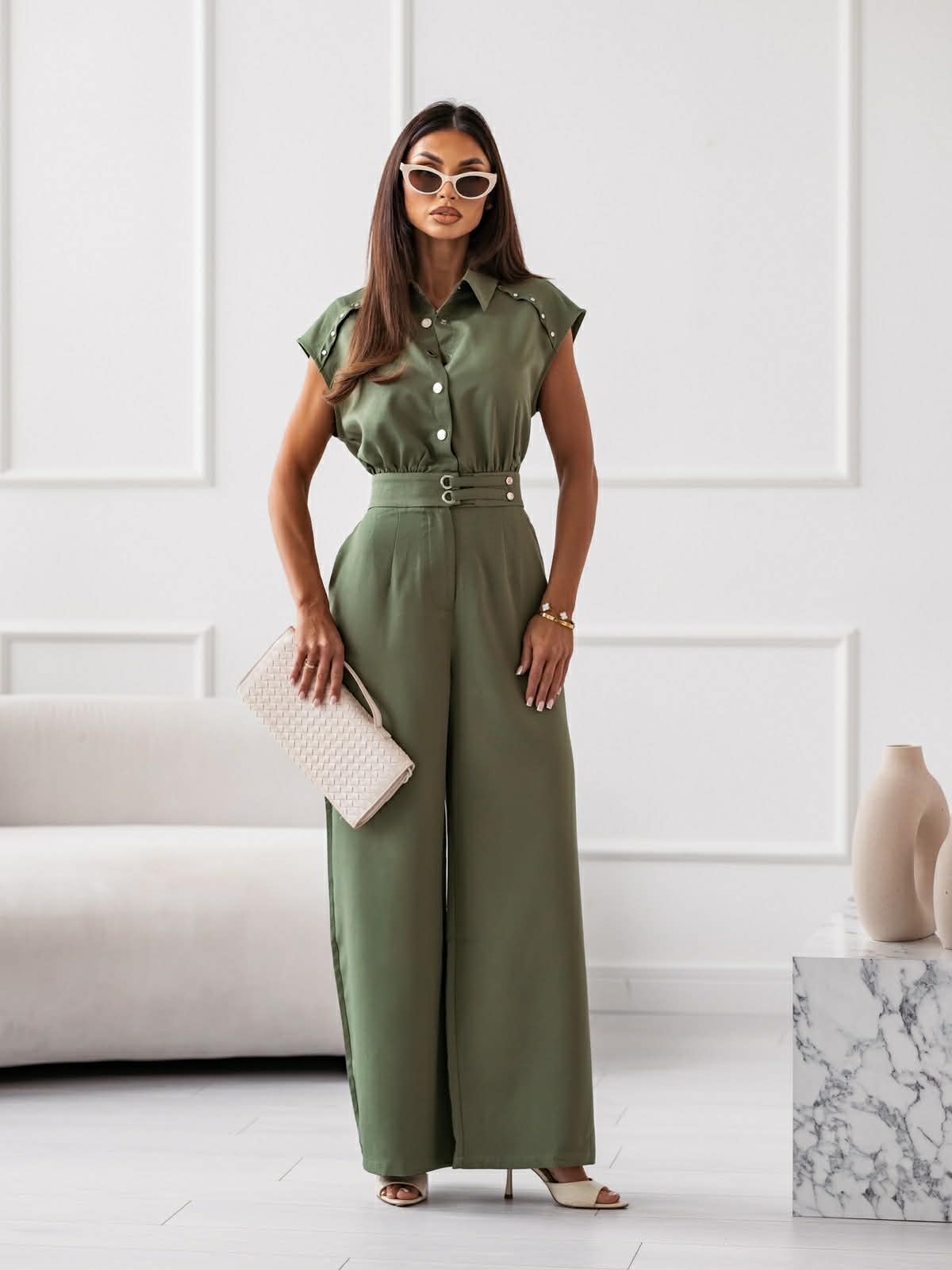 Κομψή ολόσωμη φόρμα που συνδυάζει άνεση και στυλ. Το πουκαμισοειδές επάνω μέρος με κουμπιά και η ψηλόμεση γραμμή με με τύπου ζώνη αναδεικνύουν τη μέση και χαρίζουν μια καλοσχηματισμένη σιλουέτα. Ιδανική επιλογή για chic εμφανόισεις από το γραφείο μέχρι τη βραδινή έξοδο.