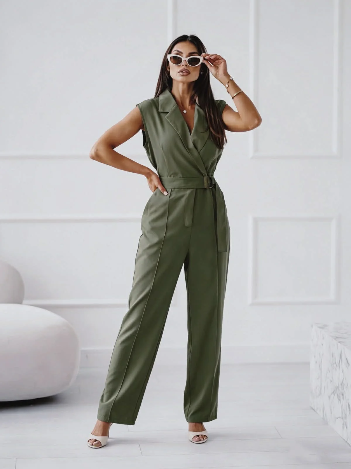 Κομψή ολόσωμη φόρμα που συνδυάζει minimal αισθητική με σύγχρονο στυλ. Διαθέτει σχέδιο χωρίς μανίκια με γιακά σακακιού και σταυρωτό ντεκολτέ που χαρίζει κομψότητα και θηλυκότητα. Η ζώνη στη μέση τονίζει τη σιλουέτα, ενώ η ίσια γραμμή στο παντελόνι δημιουργεί ένα elegant και ισορροπημένο αποτέλεσμα. Ένα διαχρονικό κομμάτι που μπορεί να φορεθεί από το πρωί έως το βράδυ, ιδανικό τόσο για chic καθημερινές εμφανίσεις όσο και για πιο ιδιαίτερες περιστάσεις. Συνδυάζεται εύκολα με πέδιλα ή γόβες για ένα ολοκληρωμένο και κομψό look.