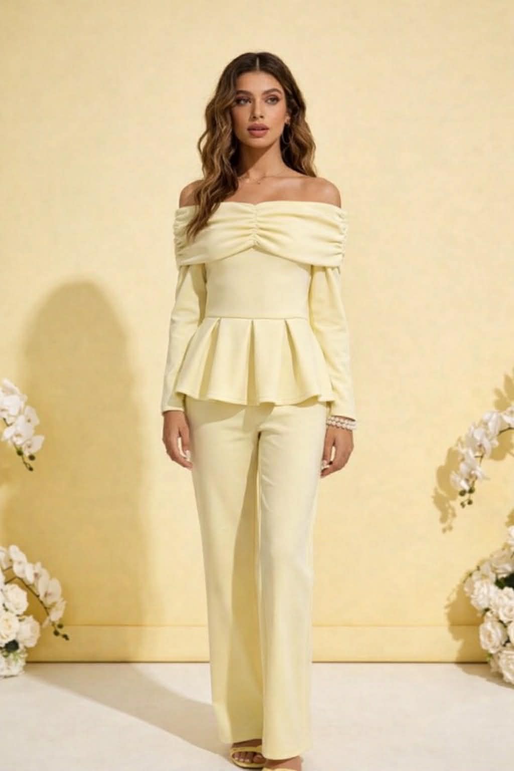 Aυτό το girly και θηλυκό σετ μας έχει πάρει το μυαλό.  Ένα σετ που ισορροπεί ανάμεσα στην ρομαντική αισθητική και τη σύγχρονη γραμμή. Το off-shoulder τοπ με διακριτικό σούρωμα στο μπούστο αναδεικνύει την σιλουέτα ενώ το peplum τελείωμα προσθέτει κίνση και κομψότητα. Το παντελόνι έχει λάστιχο στην μέση και τελείωμα καμπάνα.