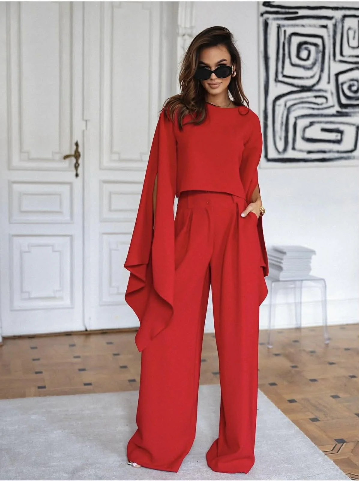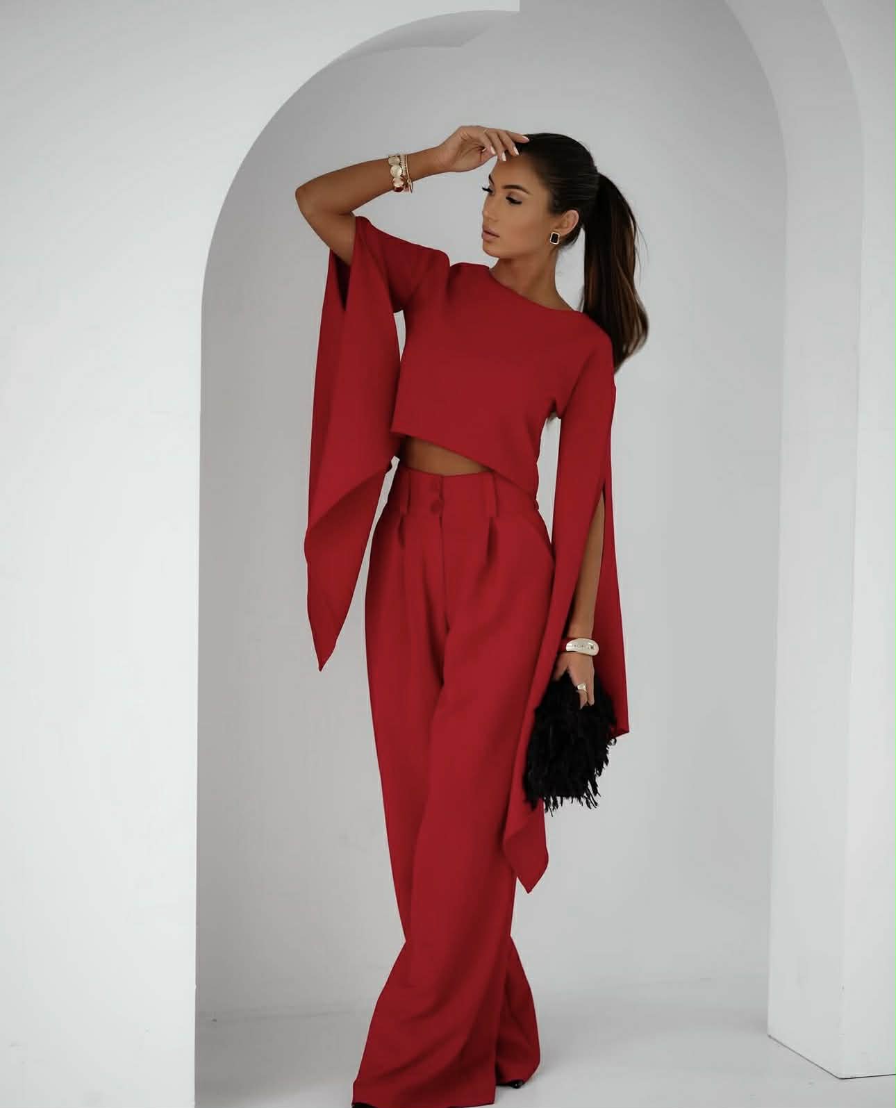 Ένα εντυπωσιακό σετ που αποπνέει κομψότητα και σύγχρονο δυναμισμό. Το τοπ με τις statement ανοιχτές μανσέτες δημιουργεί μια αέρινη και ιδιαίτερη σιλουέτα, ενώ το ψηλόμεσο παντελόνι σε ίσια γραμμή χαρίζει κίνηση και θηλυκή ισορροπία. Ένα σύνολο που φοριέται από το πρωί εως το βράδυ.
