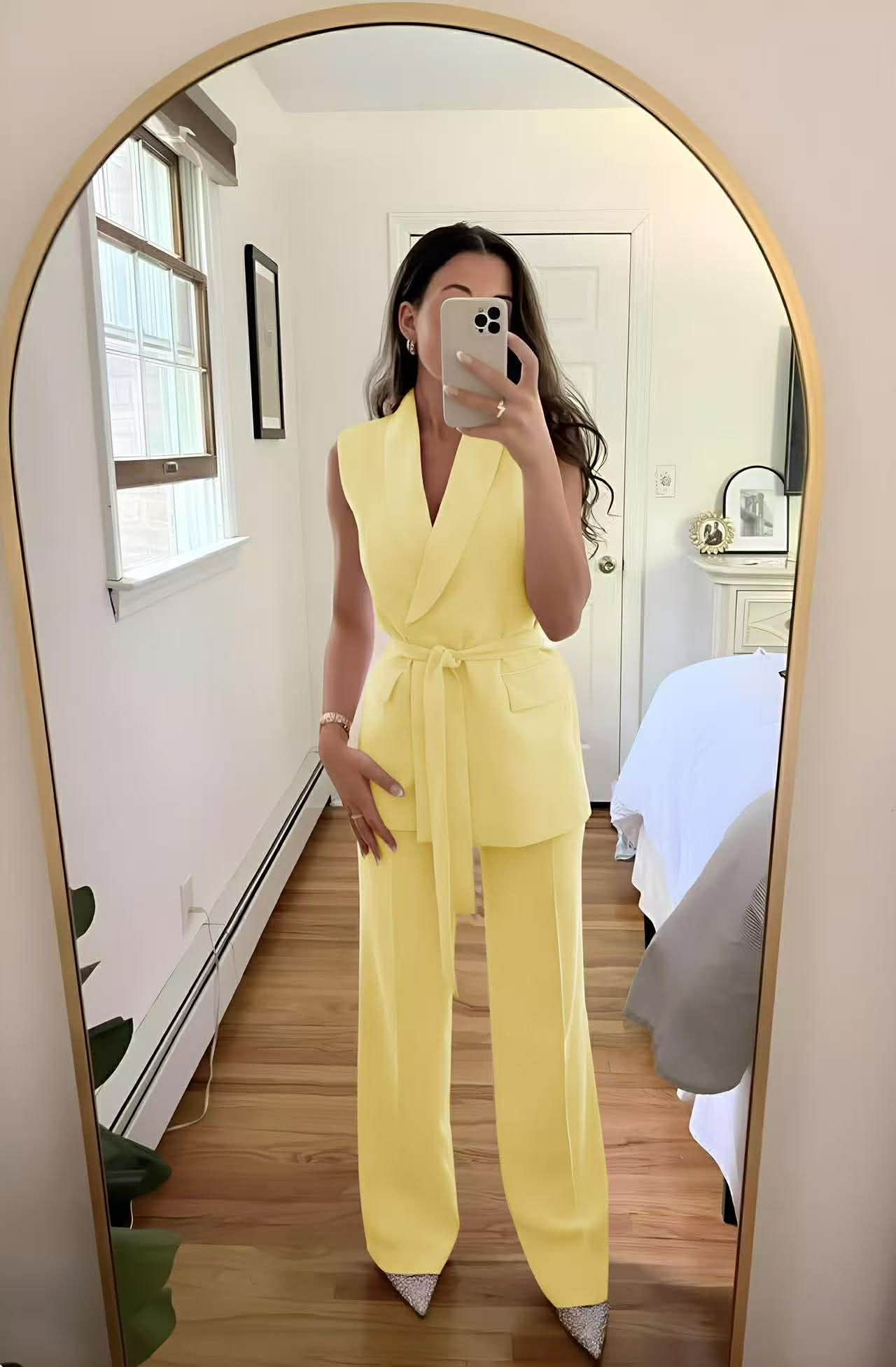 Sleeveless blazer με εντυπωσιακό γιακά και ζώνη στη μέση που αναδεικνύει τη σιλουέτα. Συνδυασμένο με παντελόνι σε άνετη wide - leg γραμμή. Ένα δυναμικό αλλά ταυτόχρονα θηλυκό outfit που τραβά τα βλέμματα και απογειώνεται με χρυσά ή ασημένια αξεσουάρ. Το γιλέκο διαθέτει φόδρα εσωτερικά.