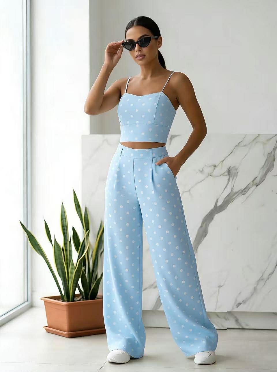 Κομψό και μοντέρνο σετ δύο τεμαχίων που συνδυάζει θηλυκότητα και άνεση σε κάθε εμφάνιση. Το crop top με λεπτές τιράντες αγκαλιάζει το σώμα, αναδεικνύοντας διακριτικά το μπούστο, ενώ το ψηλόμεσο παντελόνι με φαρδιά γραμμή χαρίζει αέρινη κίνηση και elegant στυλ. Το all-time-classic πουά μοτίβο προσθέτει μια playful αλλά και διαχρονική πινελιά, καθιστώντας το ιδανική επιλογή τόσο για πρωινές εμφανίσεις όσο και για πιο chic βραδινά looks. Το ύφασμα είναι ελαφρύ και δροσερό, ιδανικό για τις ζεστές μέρες του καλοκαιριού.