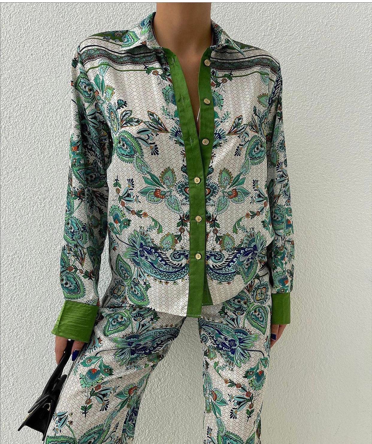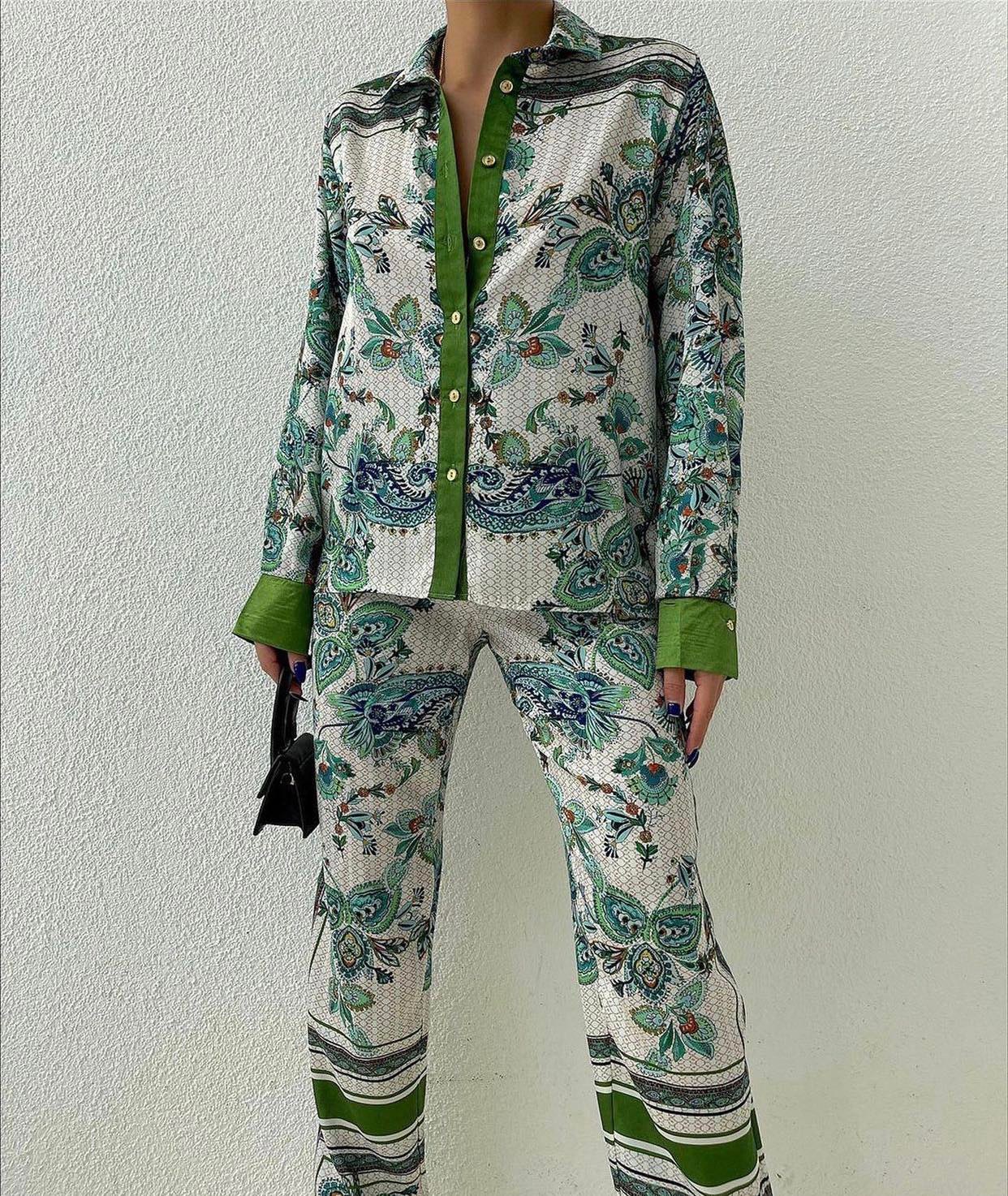 Σετ Σατέν πουκάμισο με παντελόνι σε σταθερό ύφασμα. Το Παντελόνι έχει λάστιχο στην μέση και δεν είναι ελαστικό.