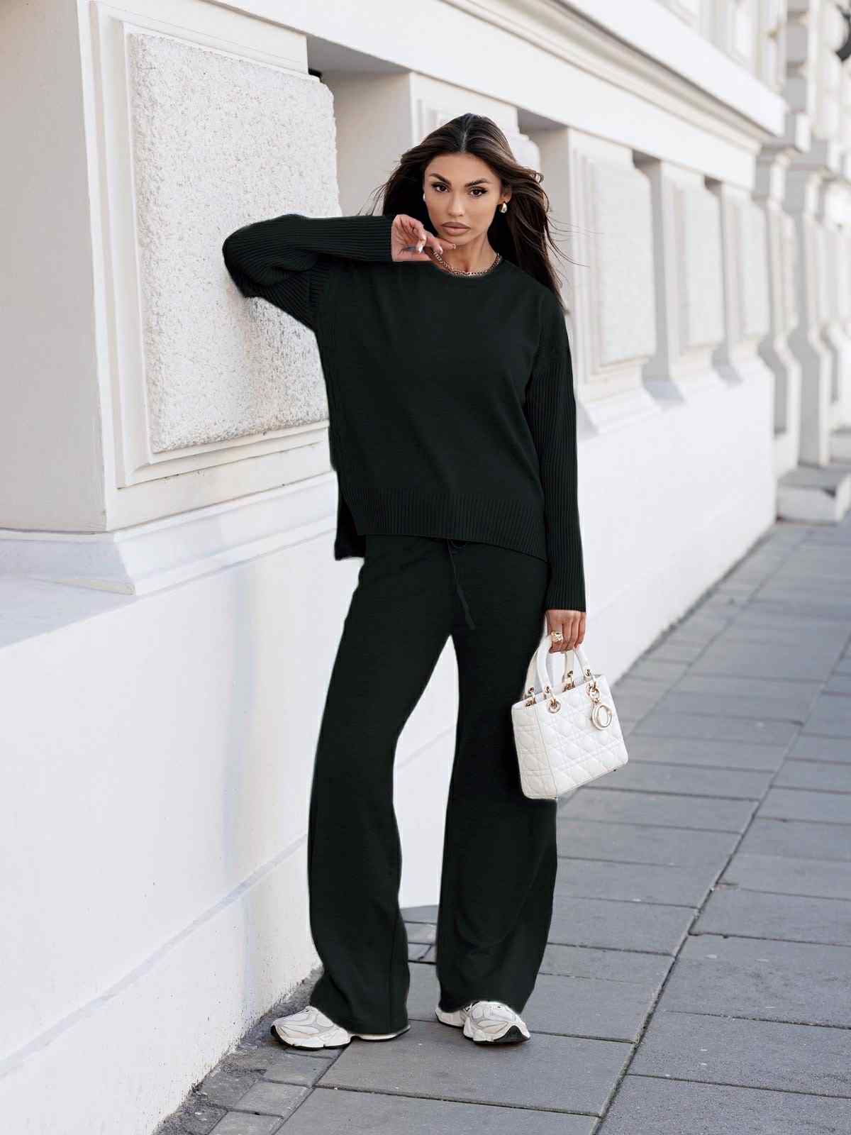 Αναδείξτε την καθημερινή σας άνεση με το απόλυτο leisurewear set. Αυτό το κομψό πλεκτό σετ είναι η επιτομή του casual chic, προσφέροντας αβίαστο στυλ από το πρωί μέχρι το βράδυ. Το σετ αποτελείται από μια μπλούζα με χαλαρή γραμμή και ένα παντελόνι καμπάνα με άνετο λάστιχο στη μέση και κορδόνι. Το μαλακό ύφασμα αγκαλιάζει το σώμα, εξασφαλίζοντας μέγιστη ελευθερία κινήσεων και απαράμιλλη άνεση. Μπορεί να φορεθεί για άνεση στο σπίτι, τηλεργασία ή συνδυάστε το με μπότες και κοσμήματα για ένα statement athleisure look στις εξόδους σας.