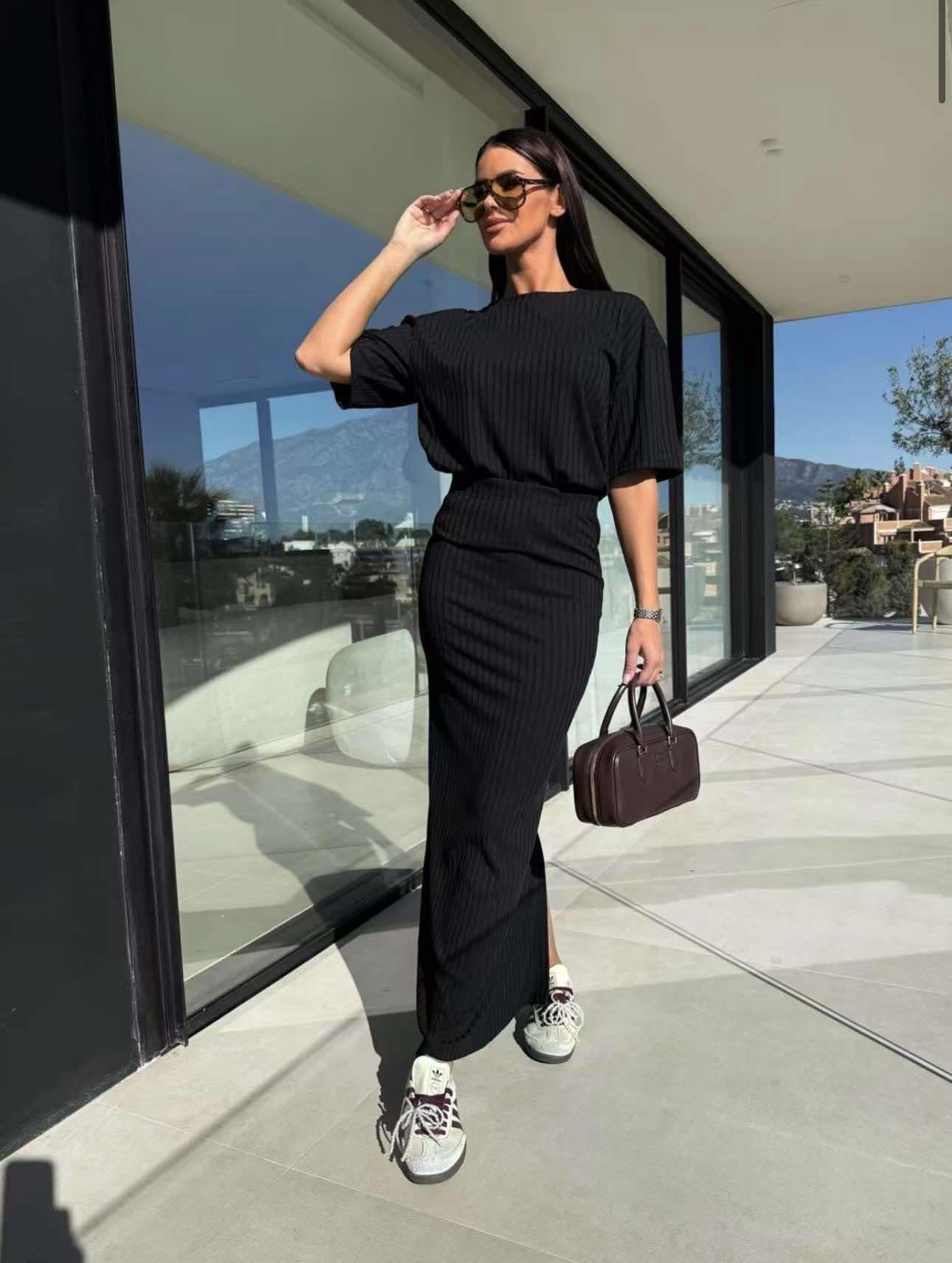Σετ φούστα με μπλούζα κοντομάνικη σε λεπτό δροσερό ύφασμα. Η φούστα διαθέτει λάστιχο στην μέση.