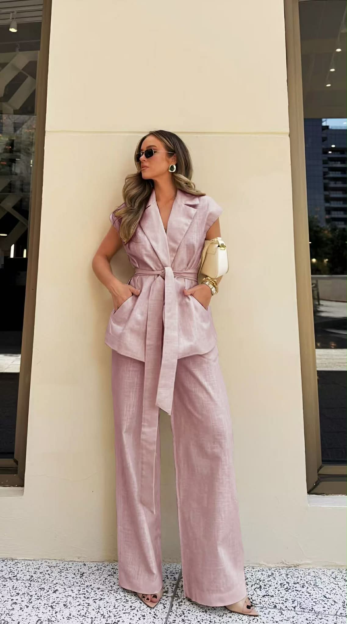 Αναβάθμισε το καθημερινό σου στυλ με αυτό το εντυπωσιακό σετ δύο τεμαχίων που συνδυάζει άνεση και κομψότητα. Αποτελείται από ένα αμάνικο σακάκι με ζώνη στη μέση που τονίζει τη σιλουέτα και μια ψηλόμεση παντελόνα με φαρδιά γραμμή για άψογη εφαρμογή και κίνηση. Το ελαφρύ, δροσερό ύφασμα το καθιστά ιδανική επιλογή για τις ανοιξιάτικες και καλοκαιρινές εμφανίσεις, από πρωινές βόλτες μέχρι πιο sophisticated εξόδους.