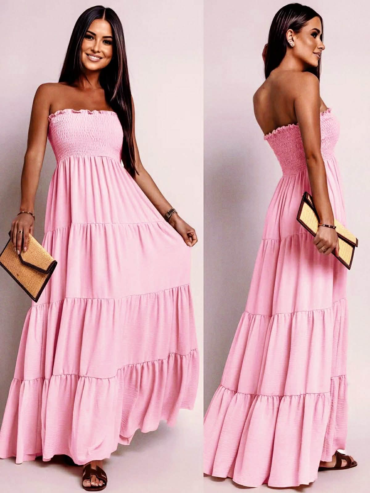 Maxi φόρεμα με στράπλες εφαρμογή και ελαστικό μπούστο που προσφέρει άνεση και τέλεια εφαρμογή. Η φούστα σε επίπεδα με βολάν χαρίζει όγκο και εντυπωσιακή κίνηση σε κάθε βήμα. Ένα κομμάτι που ξεχωρίζει για καλοκαιρινές εξόδους και διακοπές.
