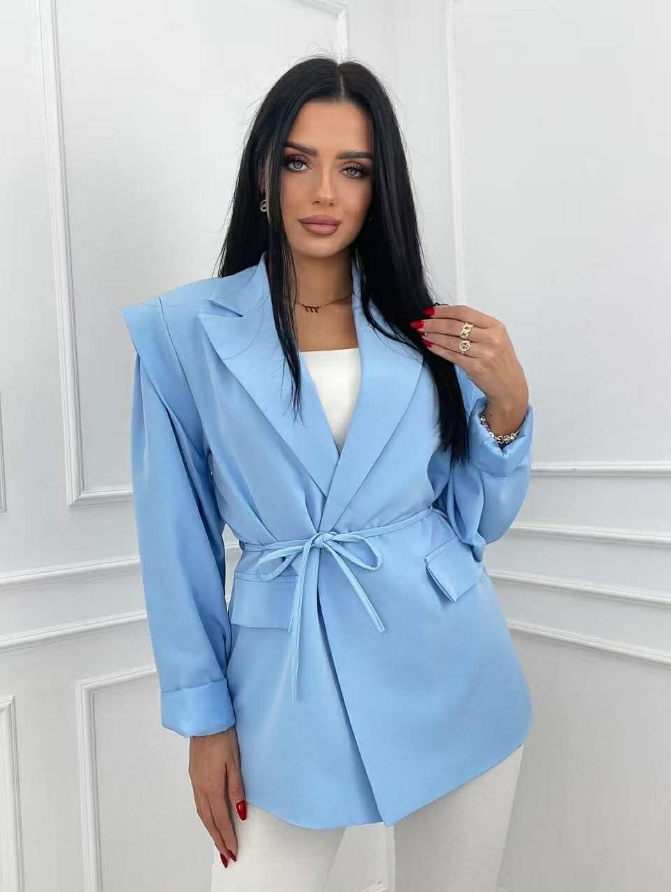Κομψό σακάκι με έντονους ώμους που αναδεικνύει τη σιλουέτα με διακριτικό και θηλυκό τρόπο. Το κορδόνι στη μέση επιτρέπει ρύθμιση για τέλεια εφαρμογή, ενώ οι διακοσμητικές τσέπες προσθέτουν στυλιστική λεπτομέρεια. Διαθέτει φόδρα εσωτερικά καθώς και βάτες.