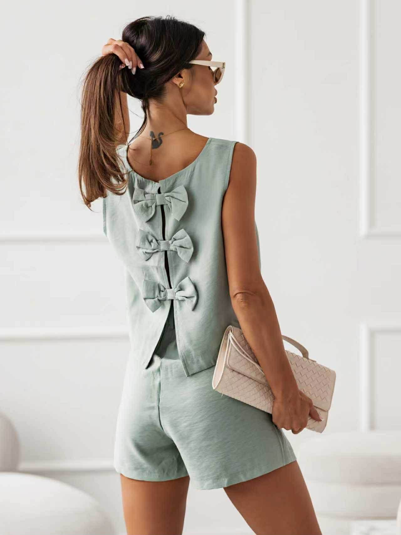 Μοντέρνο σετ σε φωτεινές απόχρωσεις που συνδυάζουν κομψότητα και άνεση. Διαθέτει εντυπωσιακούς φιόγκους στην πλάτη που χαρίζουν μοναδική θηλυκότητα. Το ιδιαίτερο σχέδιο δημιουργεί ένα elegant και ξεχωριστό αποτέλεσμα, ιδανικό για chic εμφανίσεις. Το σορτσακι διαθέτει λάστιχο στην μέση.