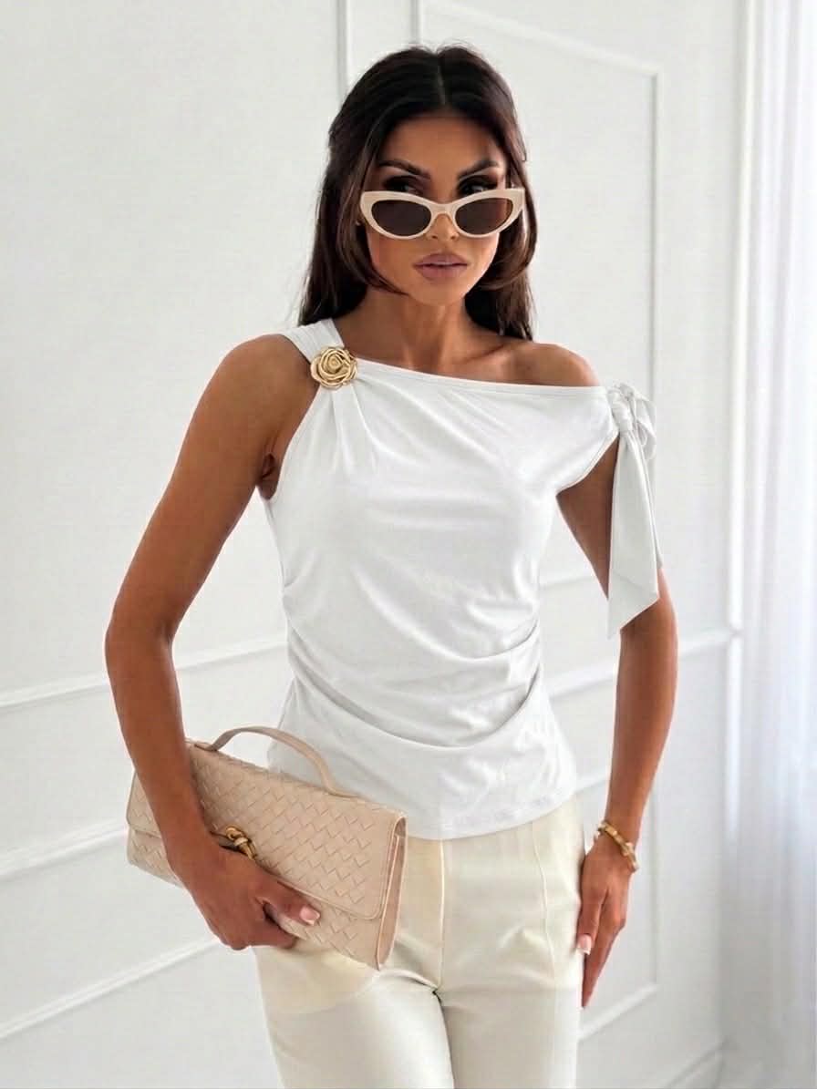 Κομψό τοπ σε ρομαντικό στιλ με ιδιαίτερο one-shoulder design. Η διακοσμητική λεπτομέρεια στον ώμο χαρίζει μία elegant πινελιά, ενώ η εφαρμοστή γραμμή αναδεικνύει τη σιλουέτα. Ιδανικό για chic βραδινά looks με παντελόνες ή φούστες.