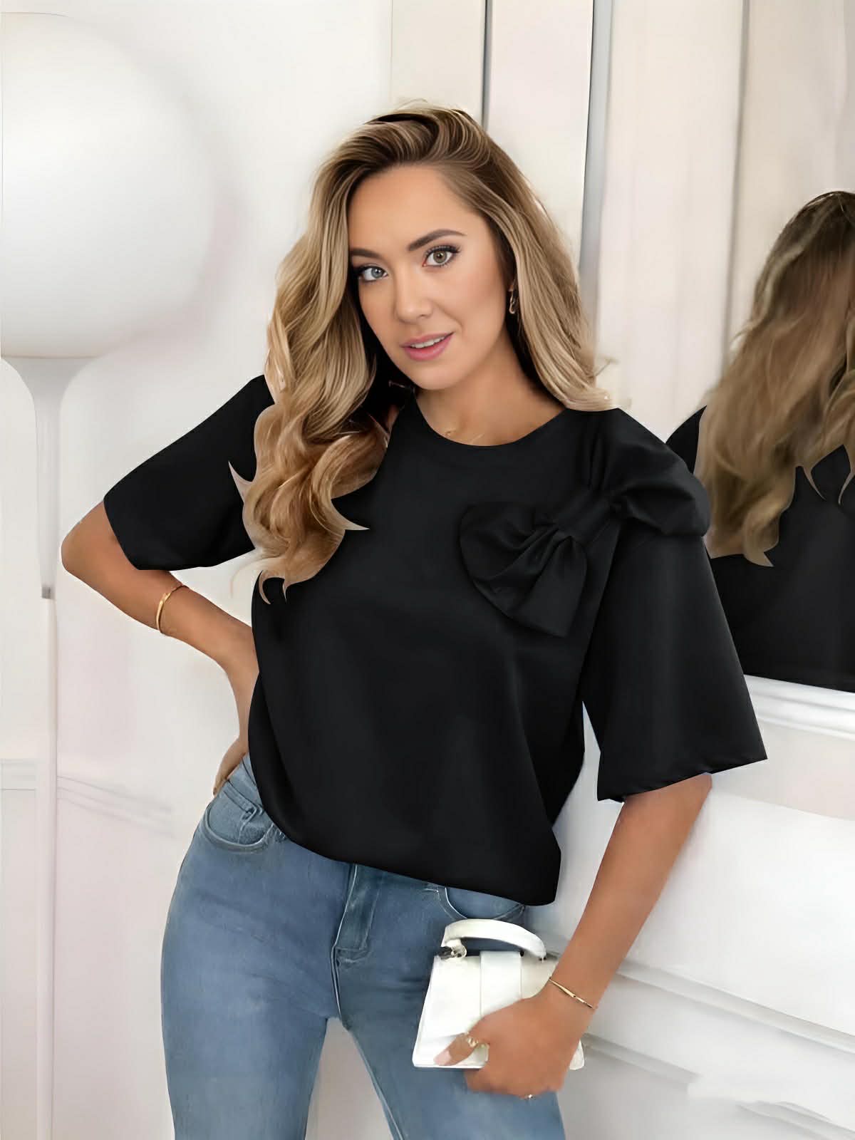 Ένα κομψό tshirt που συνδυάζει ρομαντισμό και σύγχρονη αισθητική. Η χαλαρή γραμμή του προσφέρει άνεση, ενώ ο statement φιόγκος στο επάνω μέρος δημιουργεί ένα φίνο αποτέλεσμα. Το κομμάτι αυτό μπορεί να μεταμορφώσει ακόμα και το πιο απλό outfit.