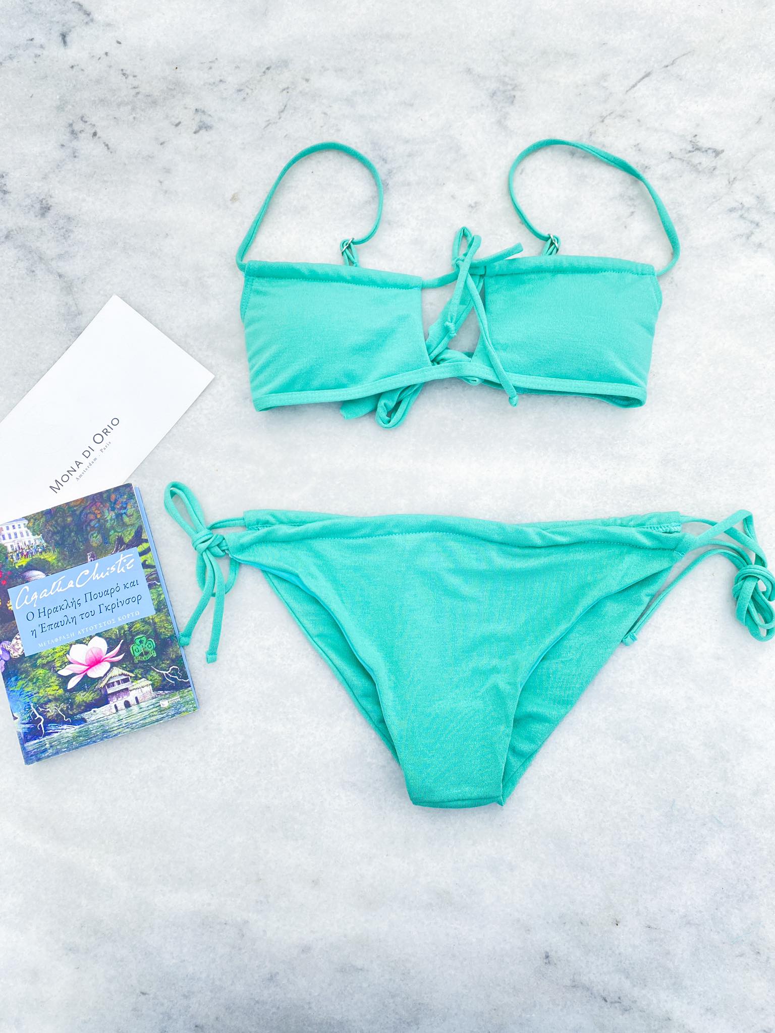 Γυναικείο σετ μαγιό μπικίνι. Διαθέτει caps τα οποία μπορούν να αφαιρεθούν. Το κάτω μέρος είναι με κορδόνια που αυξομειώνονται όπως και οι τιράντες αυξομειώνονται.  Συνδυάζεται φανταστικά με παρεό και καπέλο.