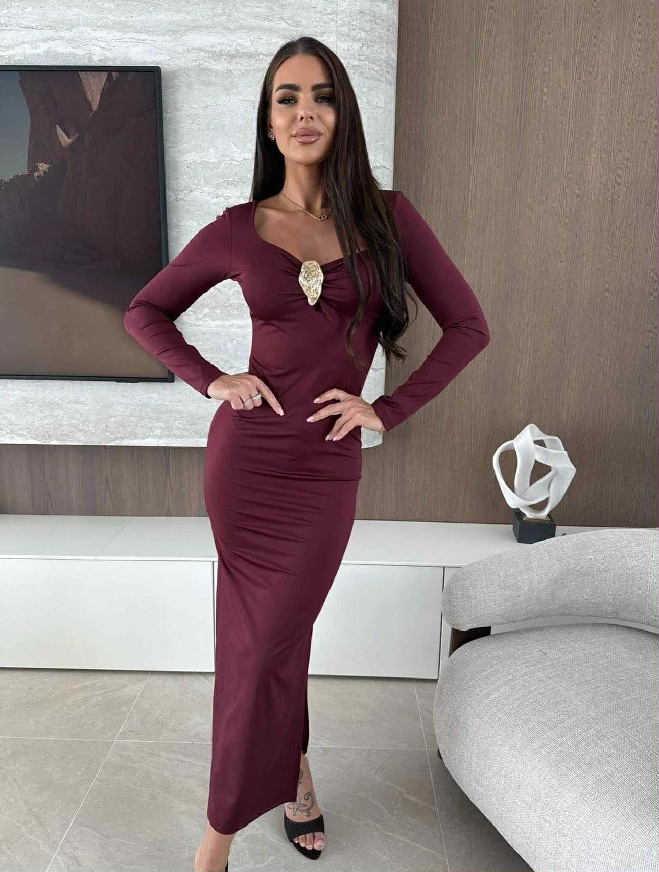 Εντυπωσιακό μάξι φόρεμα, σχεδιασμένο να αγκαλιάζει τη σιλουέτα με κομψότητα. Διαθέτει μακριά μανίκια και εφαρμοστή γραμμή που προσφέρει θηλυκό και εκλεπτυσμένο στυλ. Το μπούστο είναι ενισχυμένο με cups για καλύτερη εφαρμογή και στήριξη, ενώ το διακοσμητικό στοιχείο στο κέντρο προσθέτει μια statement πινελιά που τραβά τα βλέμματα. Η διακριτική σκίση στο κάτω μέρος εξασφαλίζει άνεση στην κίνηση και διακριτική γοητεία.Ιδανικό για βραδινές εμφανίσεις, εκδηλώσεις ή ιδιαίτερες περιστάσεις, αυτό το φόρεμα συνδυάζει απλότητα και πολυτέλεια με διακριτικό αλλά δυναμικό χαρακτήρα.